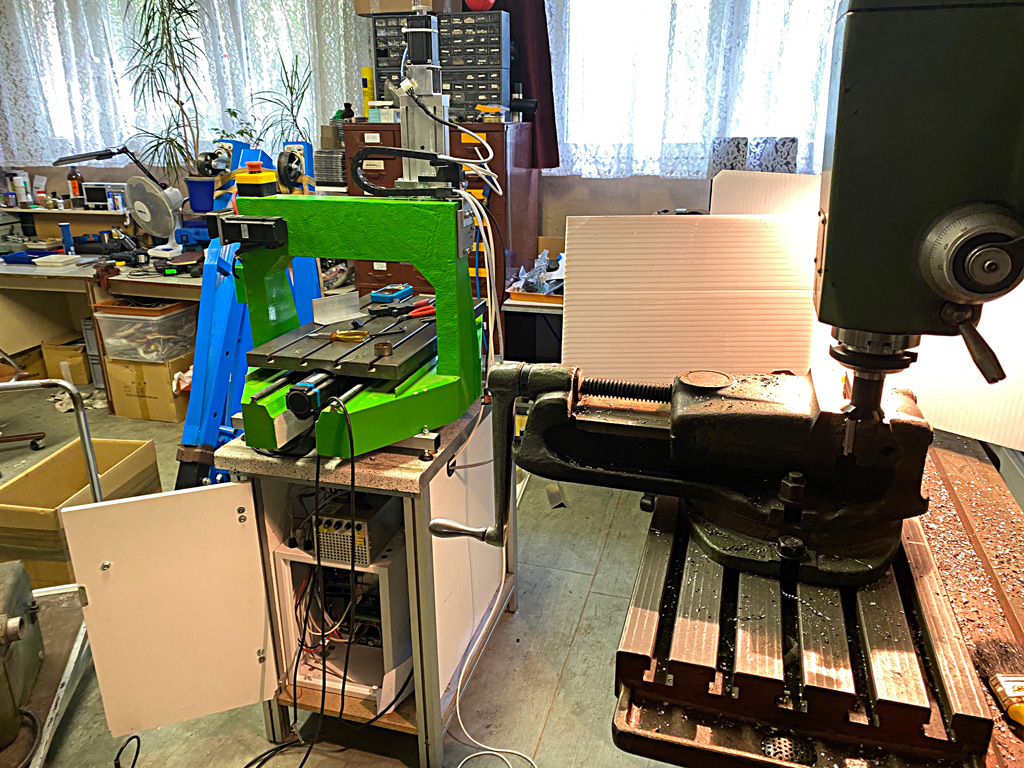 Jsou to bezmála tři roky od posledního postu. Nakonec jsem všechny choroby a nástrahy stáří překonal a dal se opět do práce. Dost věcí se změnilo. Nový je kus "nábytku" na kterém mašinka stojí. Rozvaděč s GVE 64 jsem přendal celý, kabeláž je tak půl na půl. Přidělal jsem osu Z včetně vřetena, kterým je 750W Atas po poměrně značné úpravě, která minimalizovala hluk od ventilátoru na minimum. Silové napájení stroje je 46V / 10A ovládačka 12V, použil jsem trafo 650W z hracího automatu. Ještě zapojit referáky, STOP a budu moct začít nastavovat.