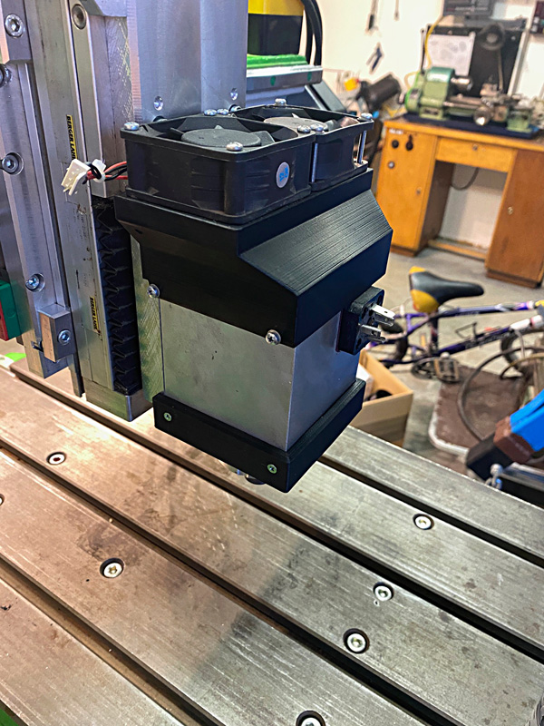 Veškerá elektrika je hotová. Referáky otestované. Koncáky nepoužívám. Přidaná druhá STOPka + nouzové stop do měniče. Poslední tři dny jsem měřil a posléze upravoval geometrii jednotlivých os. Protože jsem potřeboval ručně pohybovat osami bez šroubů měl jsem odpojené matky. Osa X byla bez problémů, na ose Y ale překáželo Zko a tak jsem ho demontoval a vytisknul novou spodní část s chladícími otvory. Horní držák s ventilátory je původní. Vřeteno je ATAS 750W. Celou dobu jsem chtěl mít hranaté vřetýnko až se to nakonec povedlo. Při otáčkách 10000/min je i po půl hodině pouze vlažné. Naostro to zkusím až budu mít bezkontaktní teploměr.