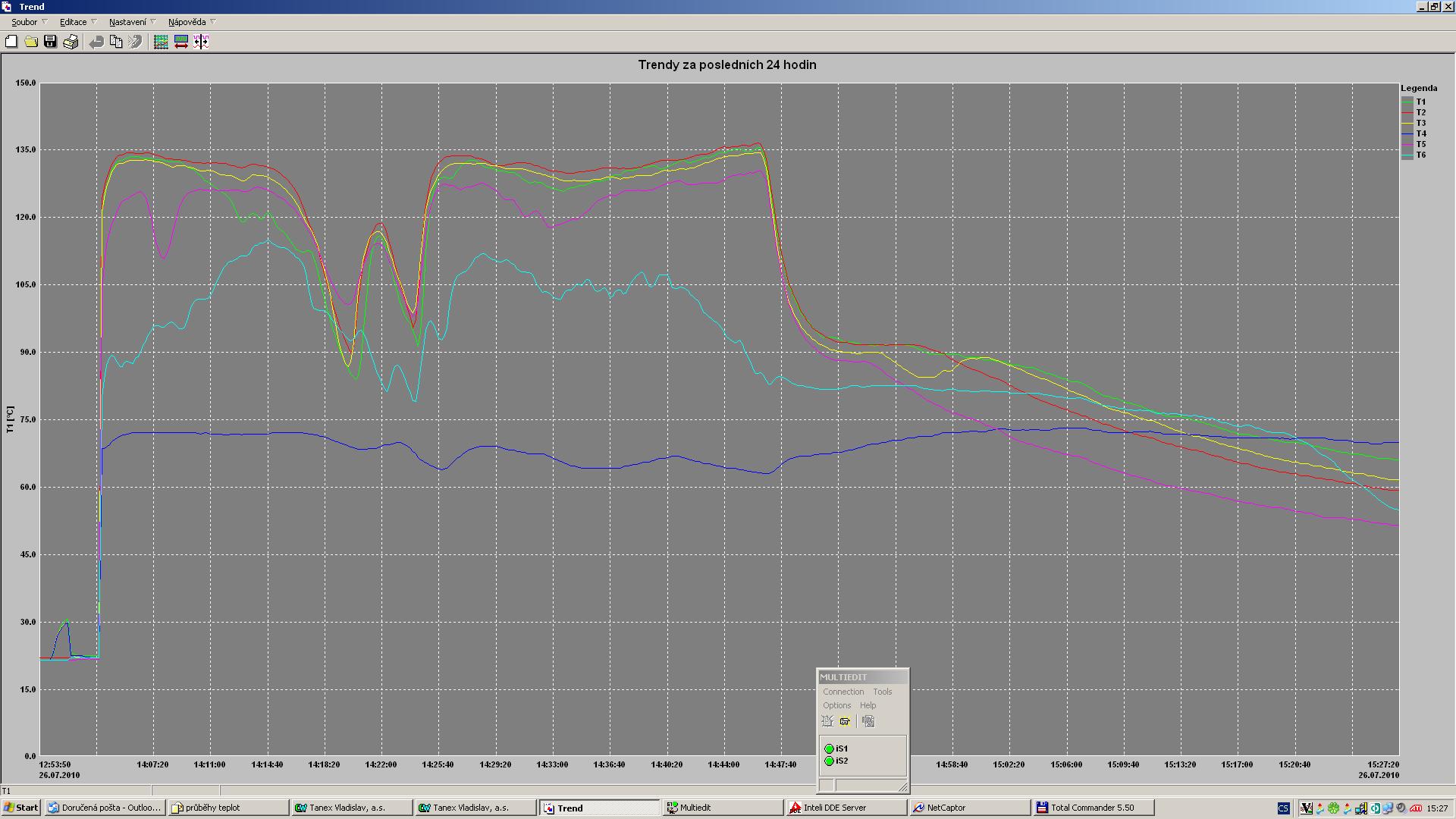 Hodnoty nejsou nezajímavé. Řazení teplot na grafu je stejně jako v reálu. Tzn. horní T1 je horní, spodní T6 je spodní atd.