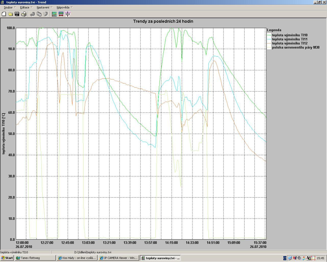 Zatím mám nahraný jen tento kousek, protože jsem měření spustil někdy kolem 14:00 a ve 14:45 jsme odstavovali, kvůli problému s rozvařenou surovinou. První pokus byl na vodu (na grafu první zhup), druhý už byl surovina.