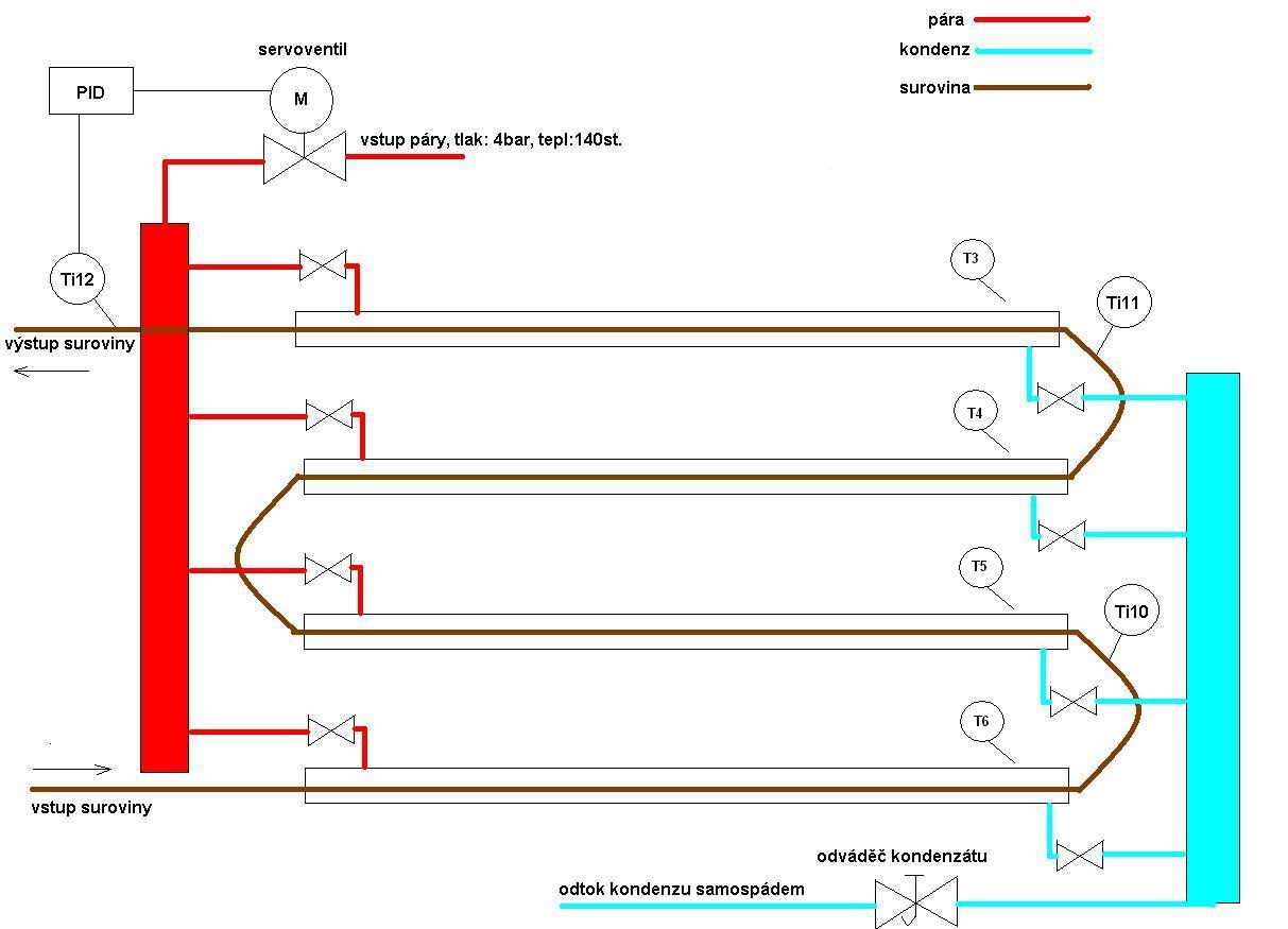 Pro doplnění jsem teploty namaloval do schématu, aby bylo jasné, kde je měřím. Další změna je, že topné roury nejsou 4 ale 6ks, proto teploměry končí T3. Nahoře si představte další 2 trubky. Už se mi to nechce znovu malovat.