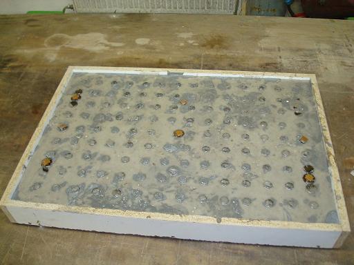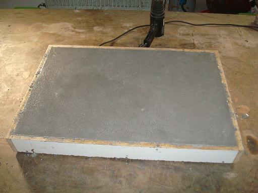 Vzhledem k tomu, že plánuju obrábění této desky frézování, rozhodl jsem se pro sendvičovou strukturu. Spodní a horní vrstva jsou s litinovým plnivem, střední je Si02 + skleněné mikrokuličky.