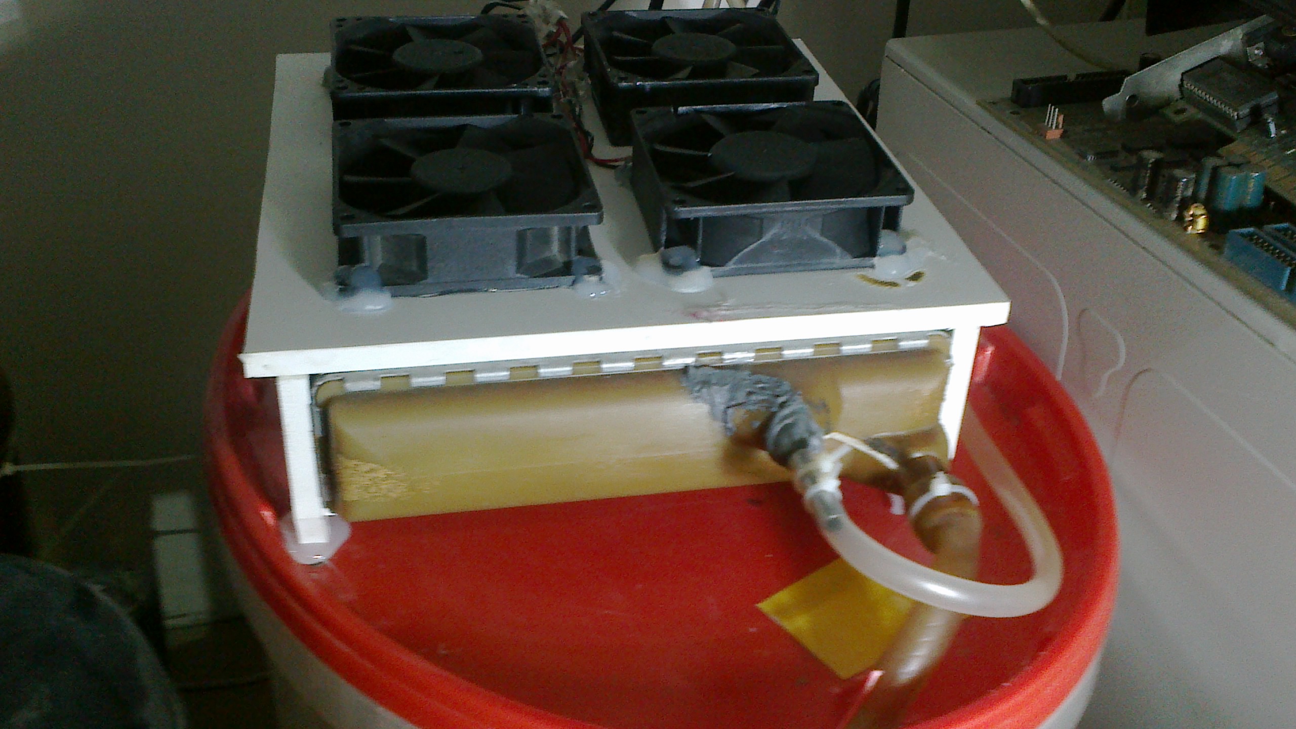 Uvažuju že dám takto dva chladiče, na každý dva ventilátory s tím, že vždycky pujdou zapnout na jeden spínač první ventilátory na obou výměníkácha a na druhej spínač pojedou všechny 4 kusy. Zkoušel jsem přes ten výměník pustit ten jeden a ještě po delšídobě bylo znát, která půlka chladiče byla studenější. Myslím, že tohle bude fungovat naprosto v pohodě. Ještě najít nějakou vhodnou nádobu, který nebude zrovna kýbl od barvy, Hades to neber nijak osobně