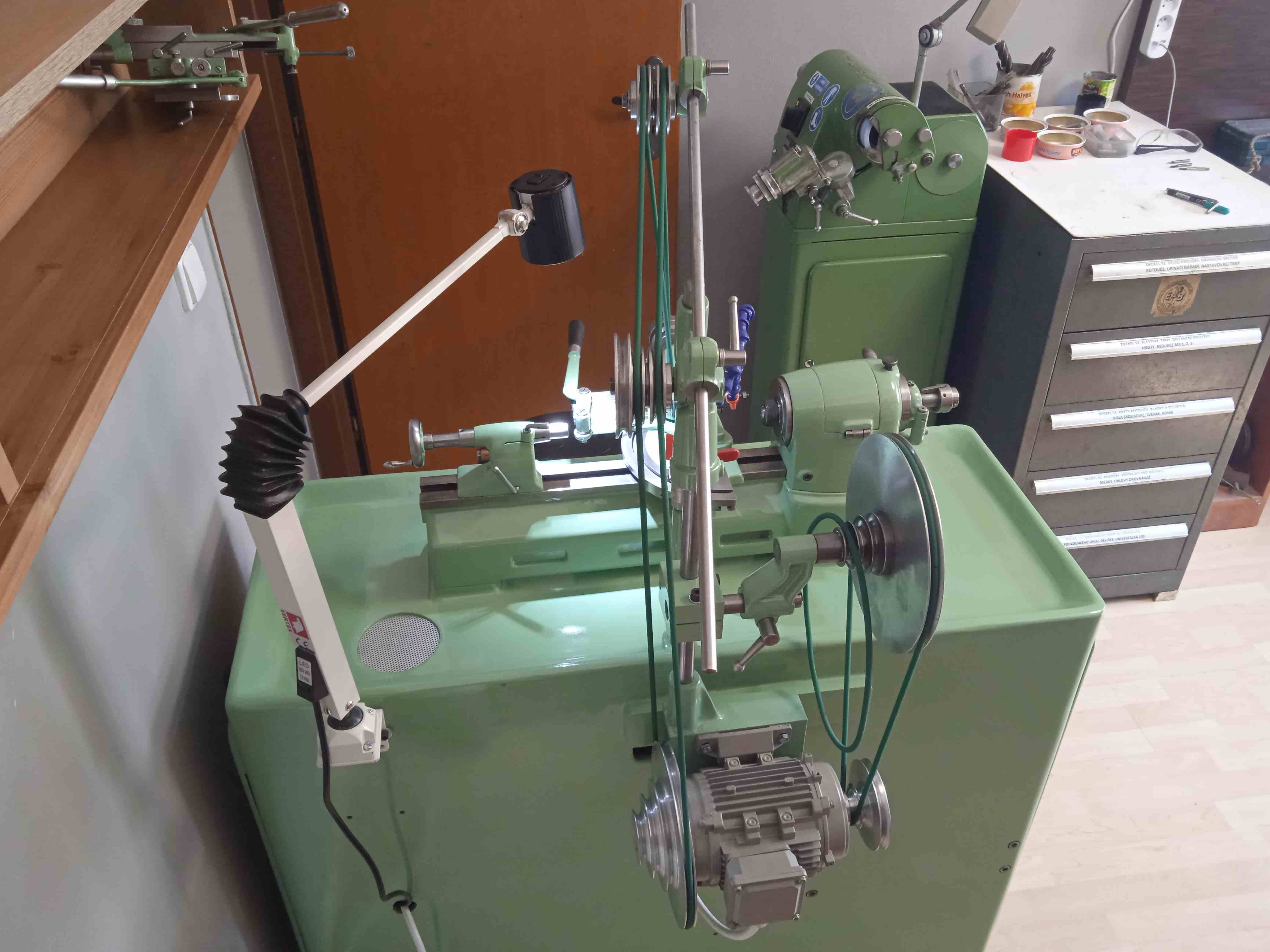 Dodělával jsem jen konzolu motoru, obě řemenice typ 222 pro pohon brusného a frézovacího vřetene a řemenici 322 pro pohon unášeného disku pevného hrotu pro broušení v hrotech (tahle sestava 102.95-300 moc vidět není) + ještě slepil kruhové řemeny a udělal brusné kotouče, protože to vřetýnko má 6mm hřídelku.