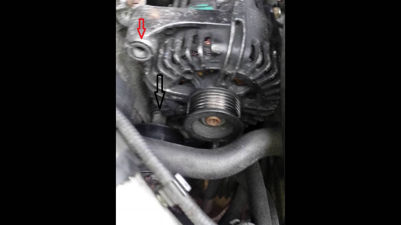 z druhé strany není ani milimetr místa, tudy nelze... navíc v hlavě je díra na M8 pro upevnění řemenice, takže matka to být nemůže (mezi dnem pro M8 a materiálem dříku je cca 2 mm materiálu)... foto jak to vypadá s řemenicí jsem našel, ale nic moc, černá šipka ukazuje ten zatracený šroub s řemenicí, červená horní šroub skrz altík a závitem v bloku
