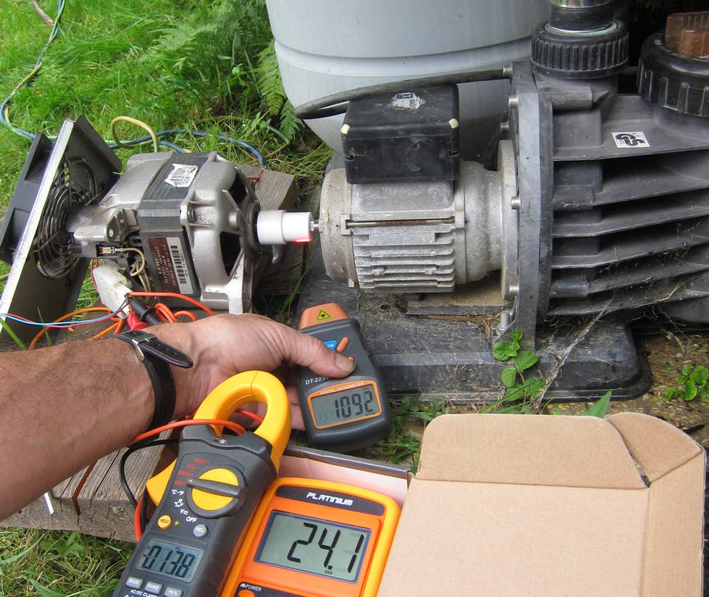 Dva soláry položené na střeše pergoly, komutátorový motor z pračky, jeden ventilátor z PC a už se testovalo, zda to utáhne čerpadlo filtrace.