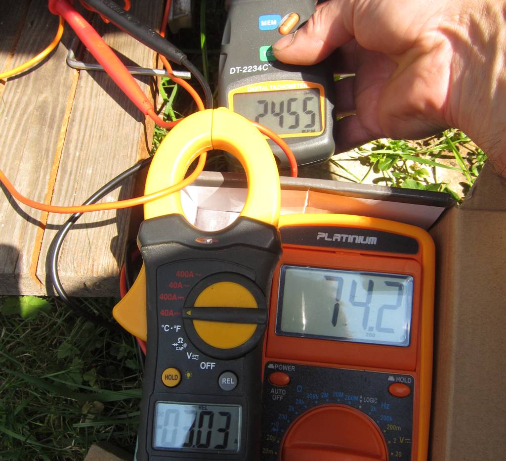 Při slunci cca 2500 otáček, pod mrakem kolem 1000, ale pořád to filtrovalo. Třetí panel už byl moc. Sice jsem se dostal přes 3000 otáček, ale motor už se dost hřál a odpálilo mi to ventilátor, pro který jsem bral 12V paralelně z cívek statoru.