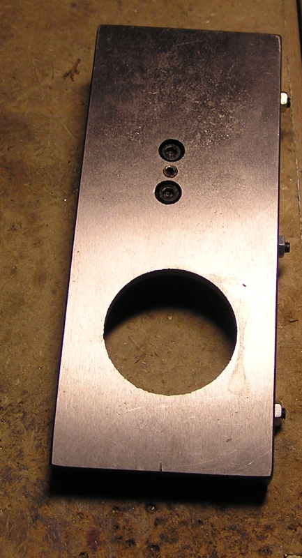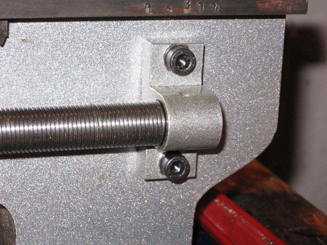 Hodně mi vadila absence dorazu velkého posuvu, tak jsem (zatím provizorně, ale co je trrvanlivějšího, než dočasná řešení?) spáchal jeden z hranolu s vyfrézovaným zářezem pro nasazení na sáně, přitužným šroubem na aretaci a odpruženým dorazem z pětky šroubu se stočeným závitem a pružiny. Jedna díra v hranolu je hladká, druhá má závit M5. Na šroub je navlečená pružina, šroub je protažený hladkou dírou a krátklý závitový konec je prošroubovaný skrz závitovou díru. Elegantní to není, funkční ano Smile