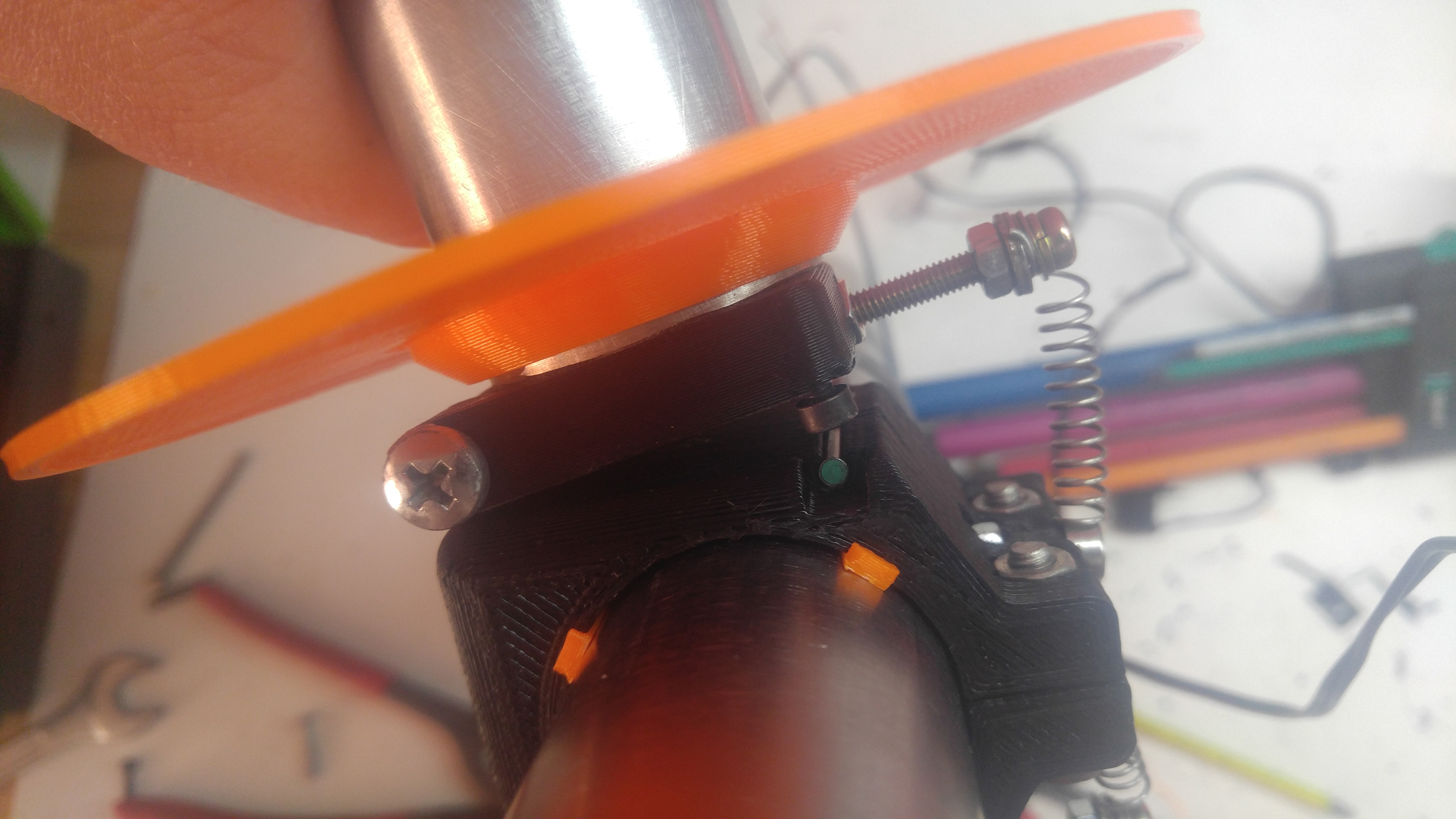 Je to videt na seste fotce, na stojanu je 3mm cidlo, na rameni je sroubek ktery to cidlo snima. Rameno je na pantu, je tam pruzina. Kdyz se filament zamota, nebo zasekne, tak se rameno pritahne k tiskarne a sepne to "filament sensor" vstup na desce.