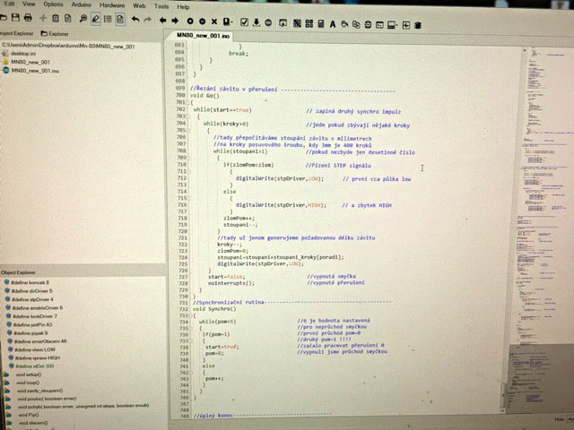 Celý pohyb při závitování jede v přerušení, hlavní program stojí a čeká na ukončení cyklu. Na změnu otáček, případně zastavené vřeteno program zareaguje okamžitě, nejpozději ale po otočení vřetena o 0,18°. Ukoncěním cyklu předá řízení hlavnímu programu, kde opět suport s nožem přejede na začátek. Tady jsem přidal možnost odjet stranou a případně změřit závit. Tyto cykly se opakují až do úplného dokončení závitu. O to se zatím stará cca 750 řádků kódu.