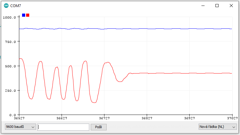 Zkoušel jsem si s tím lowpass filtrem hrát. Přepsal jsem si ho do Arduina a zkoušel, jak se to bude chovat při různých hodnotách gain. Neustále je to kompromis mezi vyhlazením při záchvěvu a reakcí na požadovanou hodnotu. Upravil jsem si ten lowpass filtr tak, že při zvýšení hodnoty má nižší gain než při snížení rychlosti. Spoustu operátorů používá poťák FEED místo TOTAL STOPu a tak potřebuji aby reakce na snížení rychlosti byla okamžitá.