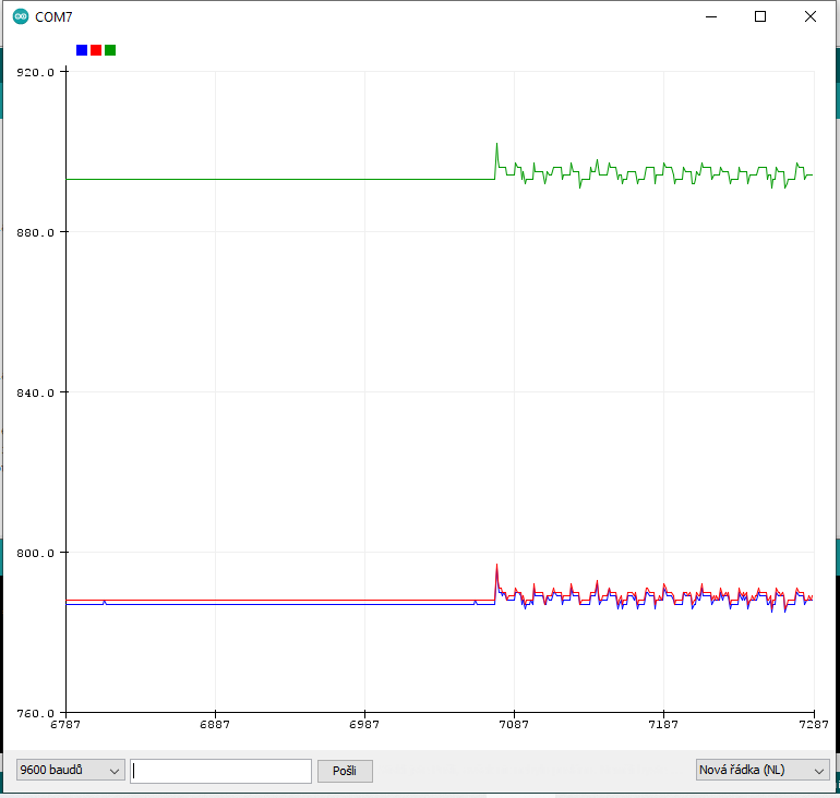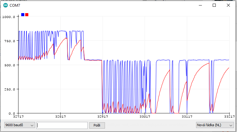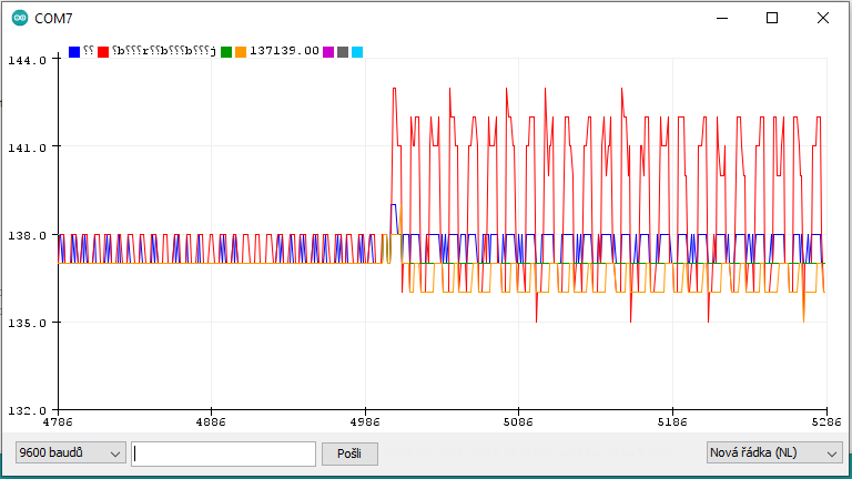 Zatím je to takový bordel kód, jen na ověření hardwaru a zjistil jsem, že v něm čtu analogový vstupy A6, A7, A6, A7 v jedné smyčce. Tak jsem to překopal na čtení jen jednou A7, ale vůbec to nepomohlo: Ovšem co pomohlo, tak jsem okomentoval příkazy, které měly na starosti blikání ledkama na výstupech A0, A1, A2, A3, D5. A najednou stal se zázrak: Dnes už valím spát, zítra budu pokračovat a přemýšlet o závěrech tohoto pokusu.