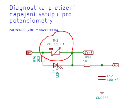V příloze přikládám elektroschema. Jedná se pin AVCC. Každopádně už jsem našel jednoho z viníků problému. Je to tepelná pojistka TH2. Na následujícím grafu jsou zobrazeny analogové vstupy A5-zelená (korekce TH2) a potenciometry A6 a A7. Levá část grafu je přemostěná pojistka TH2.