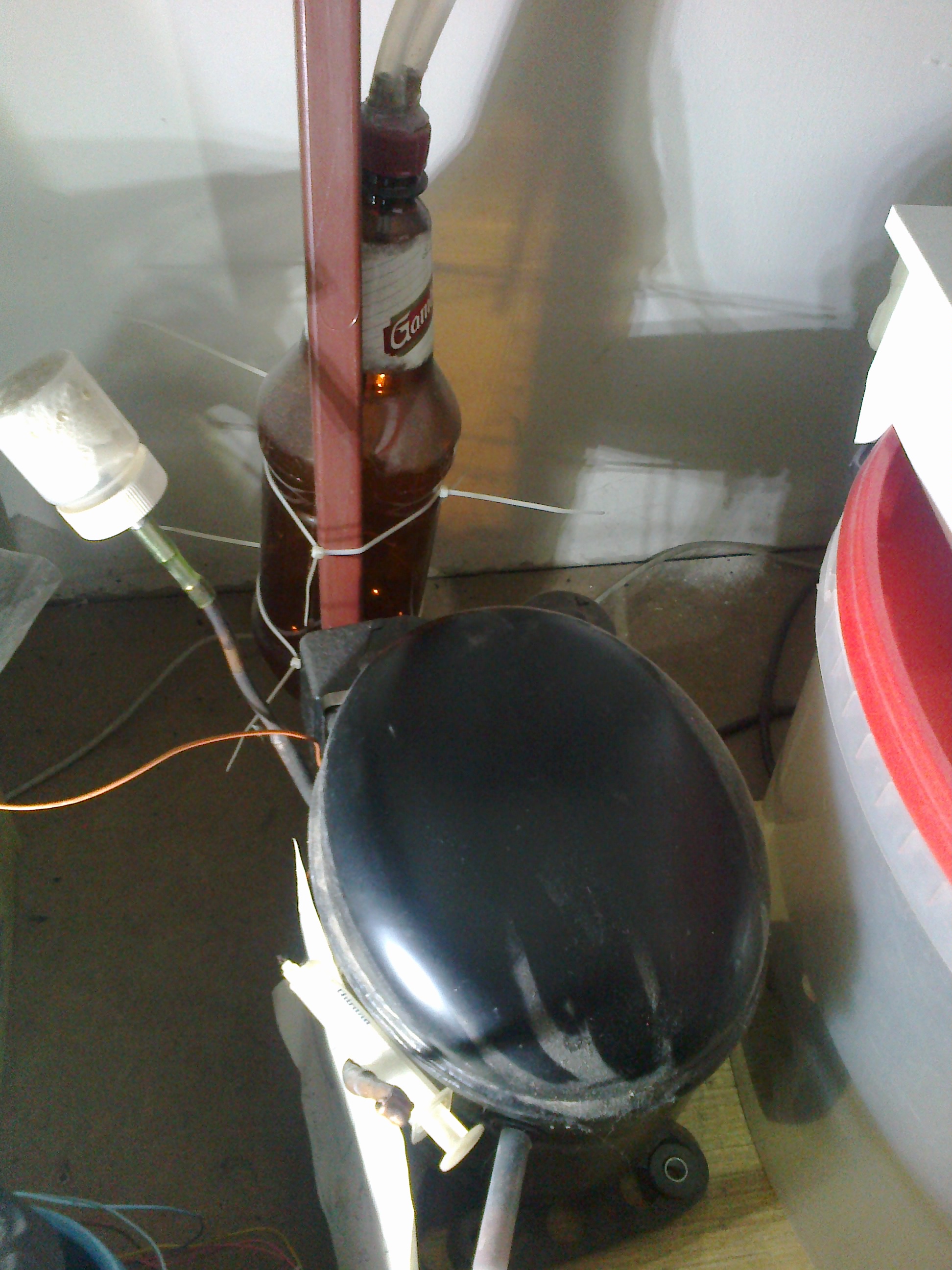 kompresor z mrazáku, ta baňka vlevo funguje jako vstupní filtr vzduchu