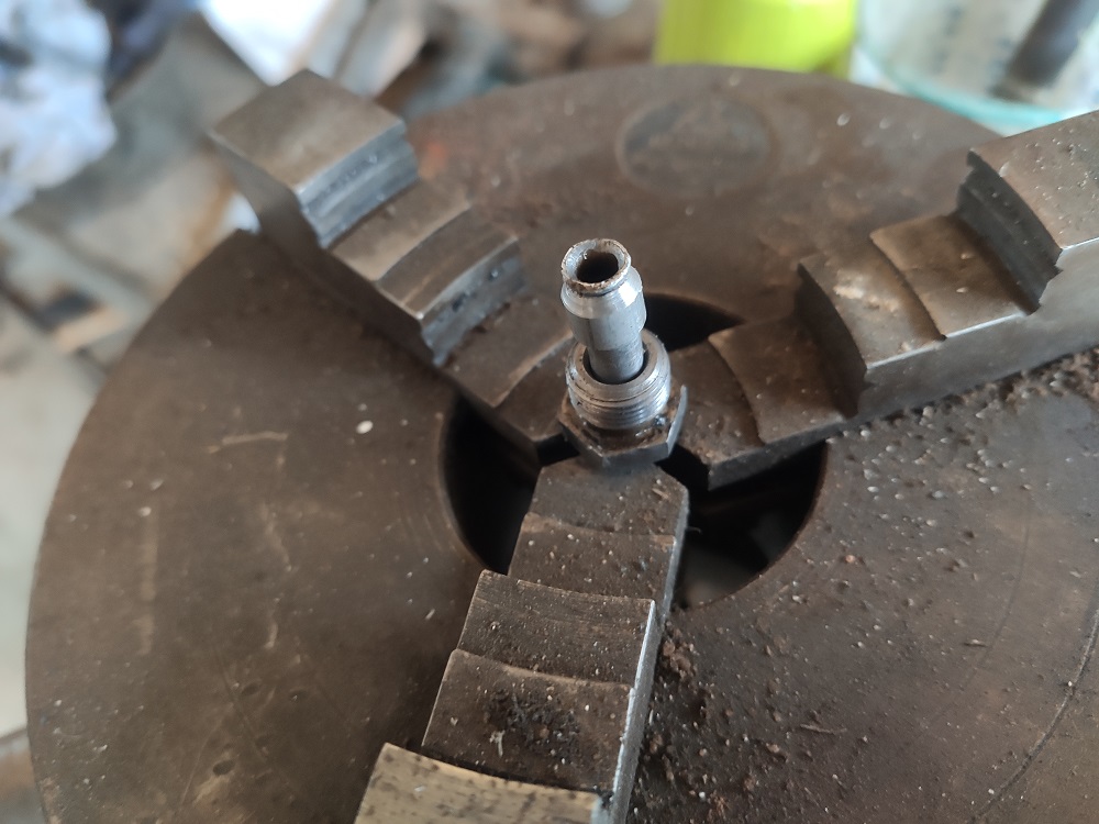 Tak ta čsn, co jsem zmiňoval, to teda není, rozměry nesedí a materiál kroužku je hliník, ne ocel. Kroužek, který vzdáleně připomíná originál, jsem si vyrobil (místo 9 mm průměr jen 8 mm), konec trubičky, kterou jsem upnul do univerzály, jsem rozklepal tak, aby kroužek nemohl slézt. Asi to nebude úplně ono, protože šroub na trubce jde dotahovat co závit dovolí, jak se kroužek pořád deformuje, ale hlavní je, že to neteče. Hádám ale, že takhle zbastlené to je cca na jedno použití, víc povolení/utažení to nevydrží. Příště ten kroužek vyrobím se správným průměrem a úhly kuželu.