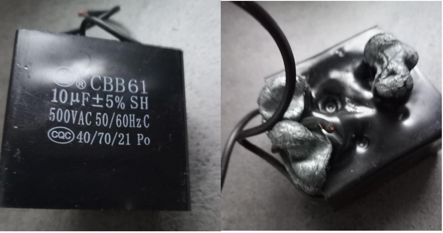Kondenzátor 10 mikro, měřím 0,5 mikro. Vlastníkům brusky doporučuju koupit jeden do zálohy, nebo rozebrat a vytáhnout ze svorkovnice, dokud funguje.