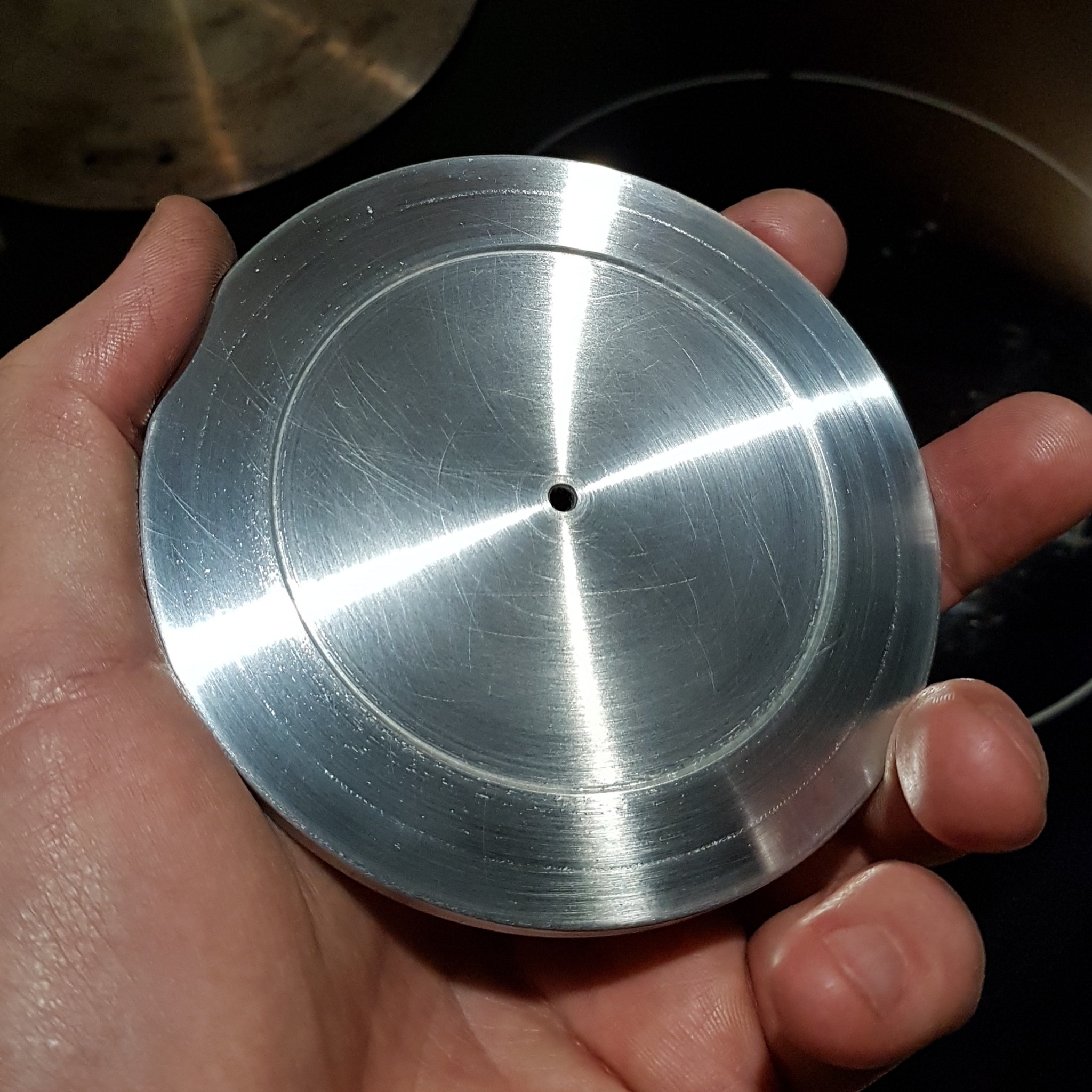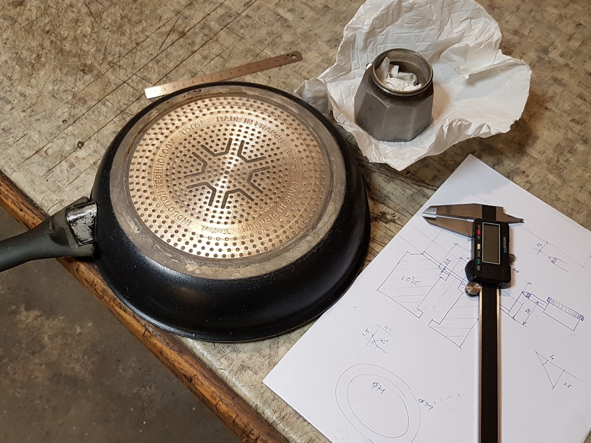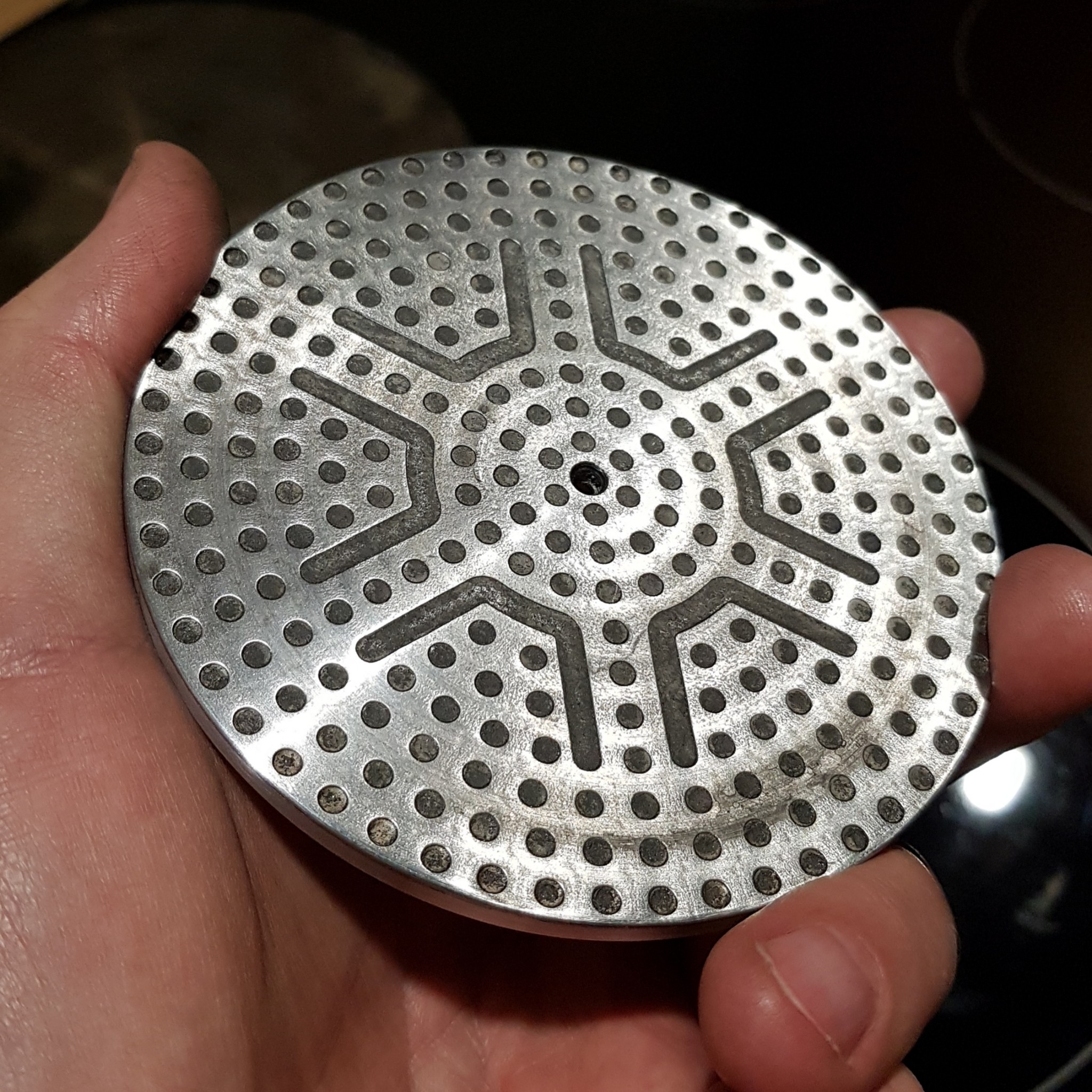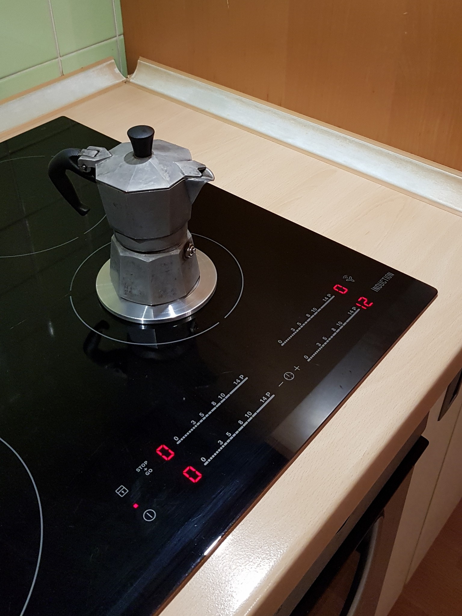 Takový večerní experiment. Redukce indukce - hliníková moka konvička (koupená redukce je strašně velká, 90% plochy vytápí byt, menší jsem nesehnal, vždycky mě to štvalo a dnes se vyhazovala pánev). Nevím, co to vydrží (nečekal jsem bimetal
