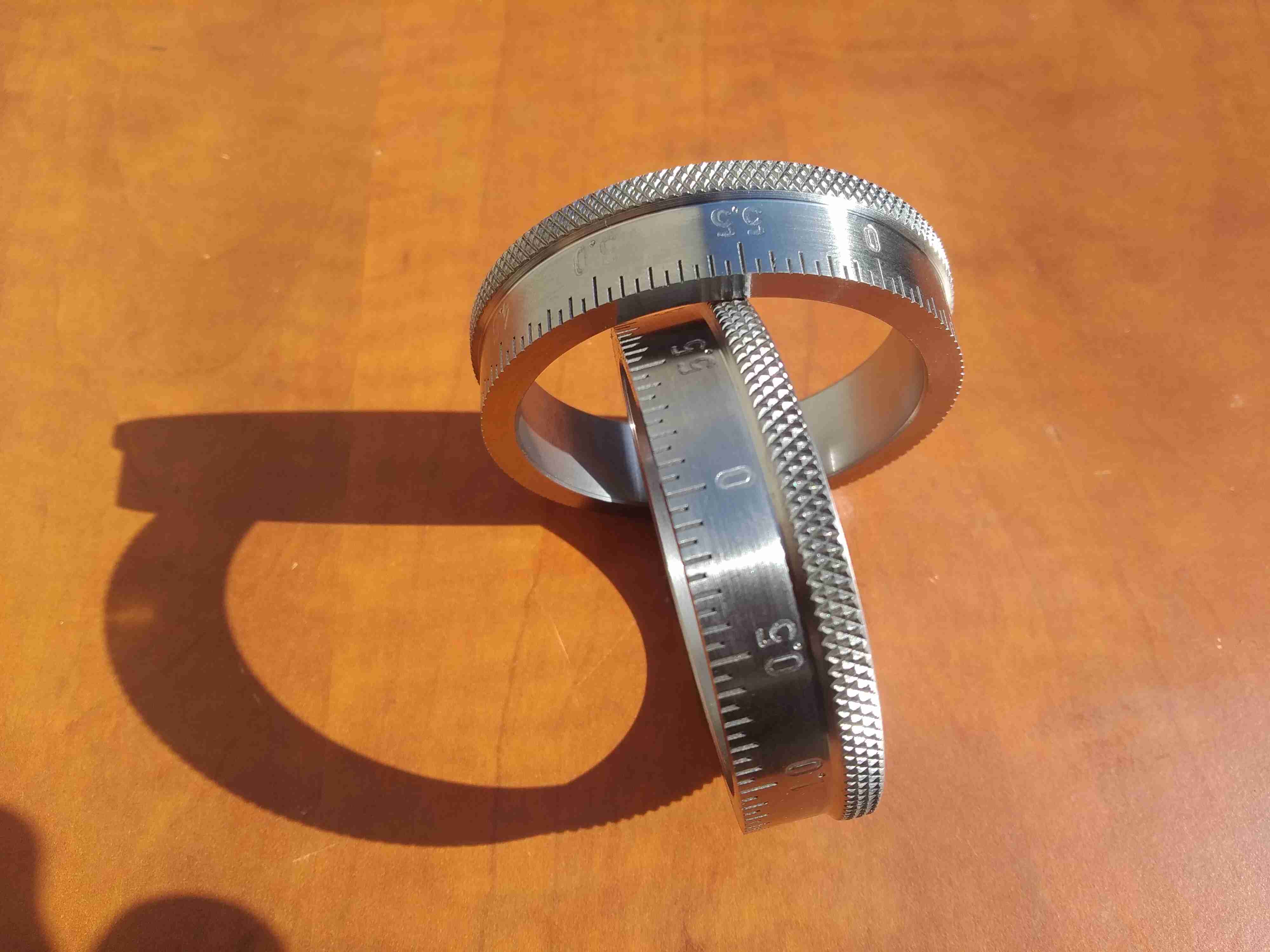 u toho plastu bych to vzal ostrým nožem, ale kovový dělám vždycky v páru a pak stupnicema proti sobě na trnu obrousím aby ta přední hrana se stupnicí byla ostrá, před tím strhnu hliníkovým hranolkem ty špony, protože jinak se umí zabrousit do čárky. Tohle jsou třeba stupnice na SM16, i když jsem měl dělat jen jednu, dělal jsem jednu navíc abych to mohl zabrousitMr. MR píše: ↑4. 4. 2021, 6:39 Tumlik -> delal jsem dva. Jeden na posuvovy sroub stolu, tam slouzi nonius zaroven jako zarazka, je procepovany kuzelovym kolikem. Ten mam z 12050. Tento na nozovku jsem zkusil z plastu kvuli kontrastu. A taky proto, ze spodni cast nonia s ryskou je nalisovana na litinovem tele toho suportu. Nechtel jsem tam rvat zelezo. Oba noniusy mam vymalovane takovyma tema barvovyma mackacima fixama a utrene hadrou. Kupodivu to celkem drzi i v tom plastu. Cim se to ma barvit doopravdy? Jo a je nejaky figl na utrzeni spon? Na tom kovovem jsem je vzal smirglem, ten plastovy ale musi mit drazky i po obvodu, spony nesly jinak urvat.