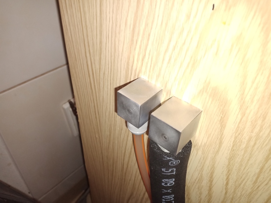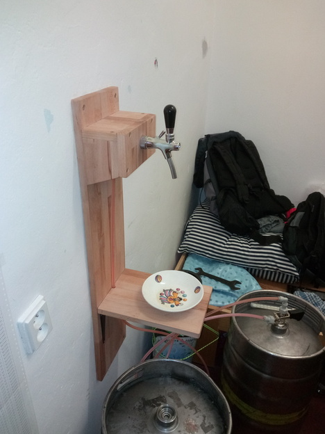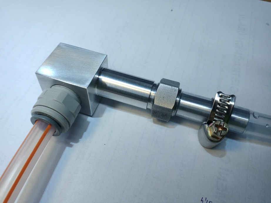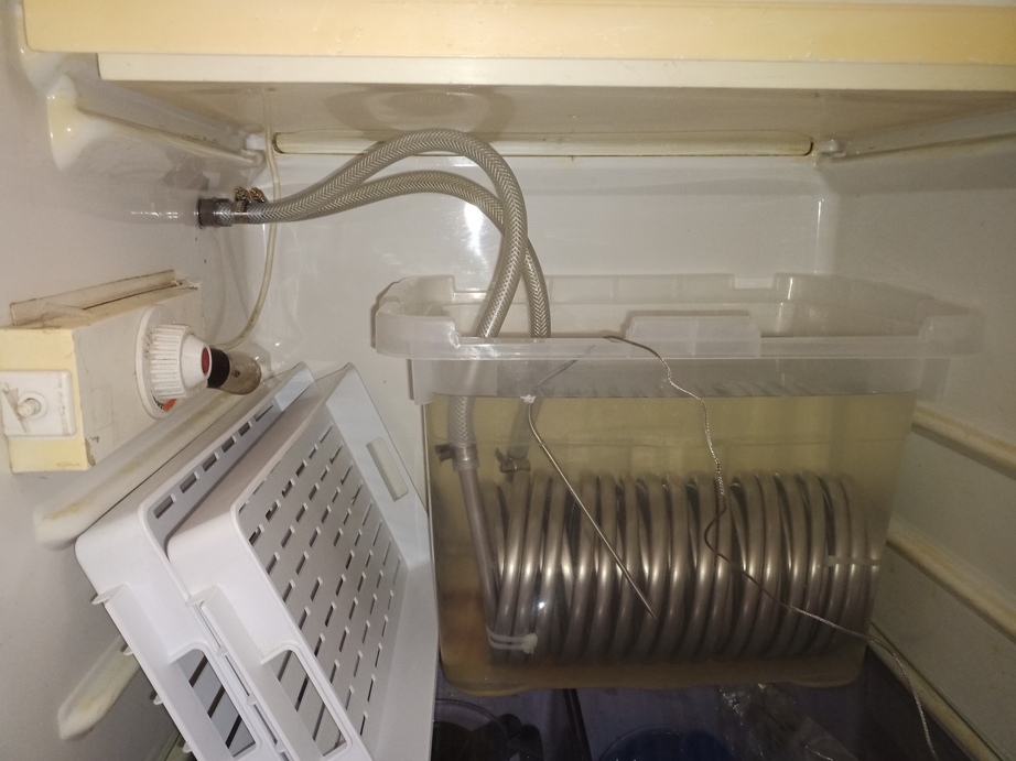 K dispozícií bola stará chladnička a chladiaca sľučka z nerezu. Vytočil som teda (frézku nemám) prechodky cez stenu chladničky opatrené závitom na rýchlospojky a závitom M16x1 na pritiahnutie k stene chladničky, vyrobil zodpovedajúce matice, vysekol tesnenia a poskladal to dohromady.