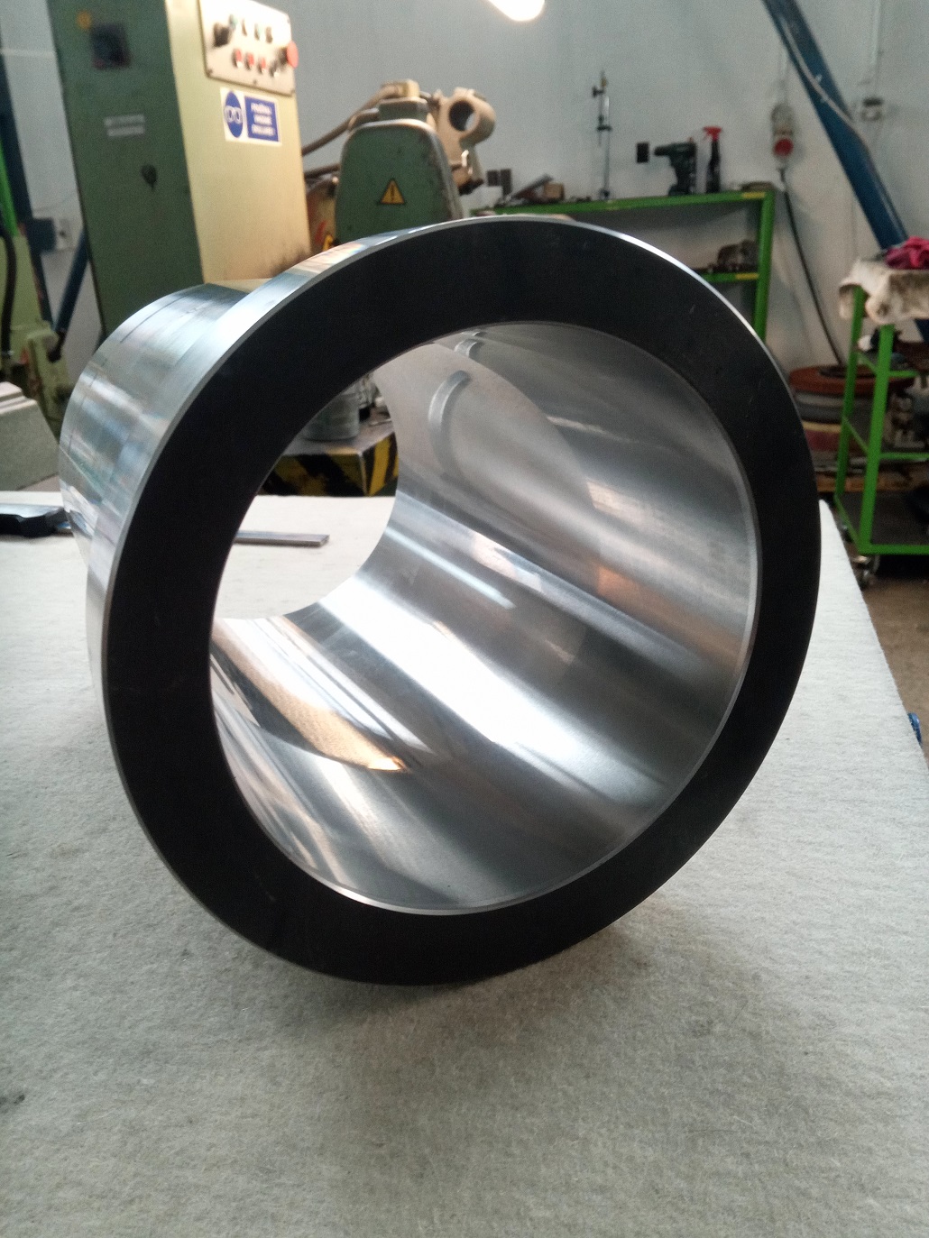 Rúra z K110 60HRc, brúsený vnútorný priemer 154mm na hĺbke 280mm na šupu z jednej strany bez otáčania.