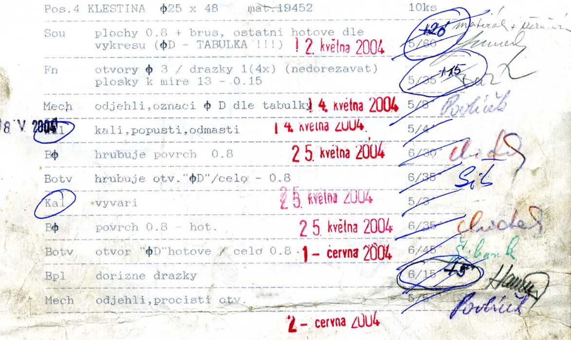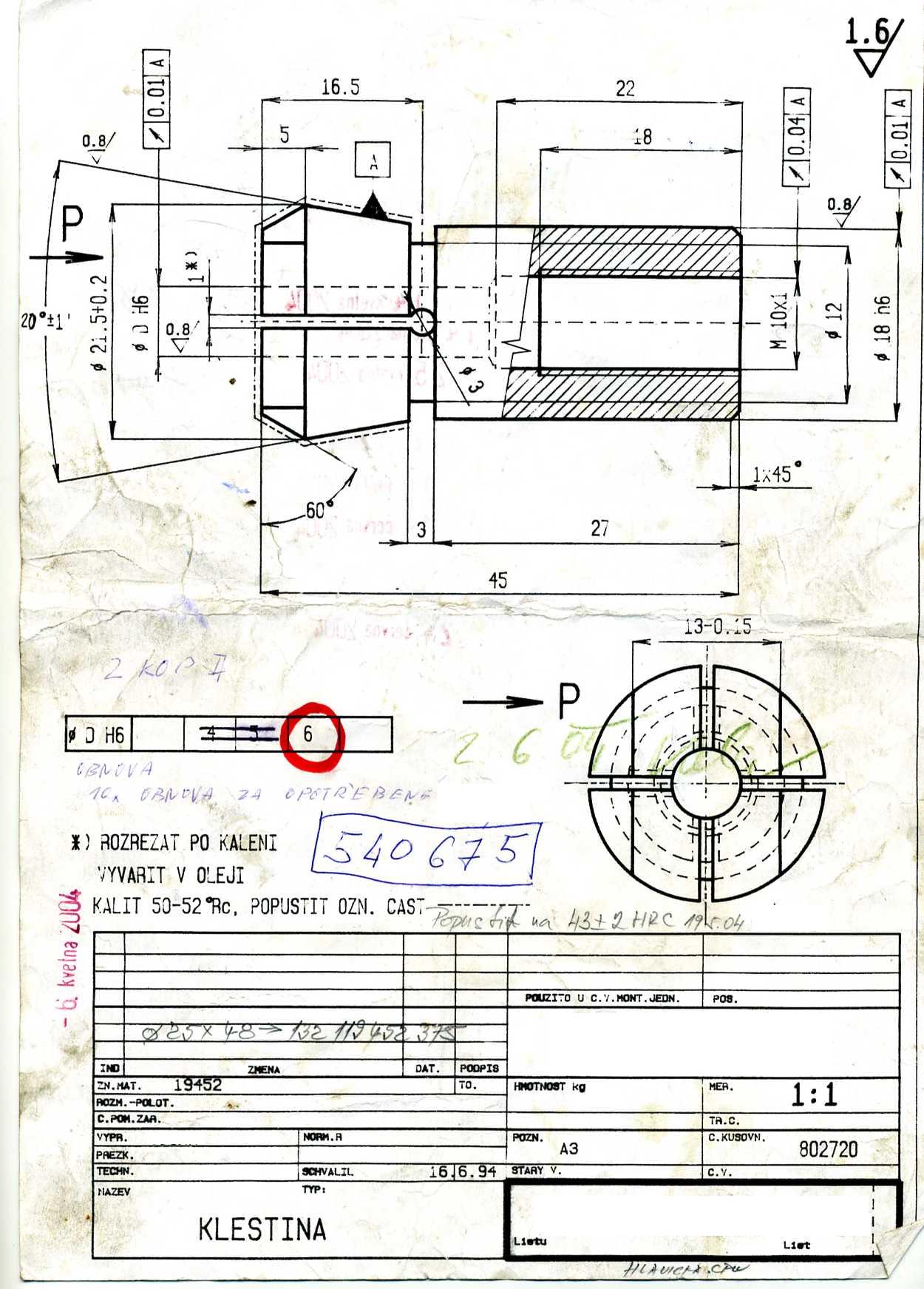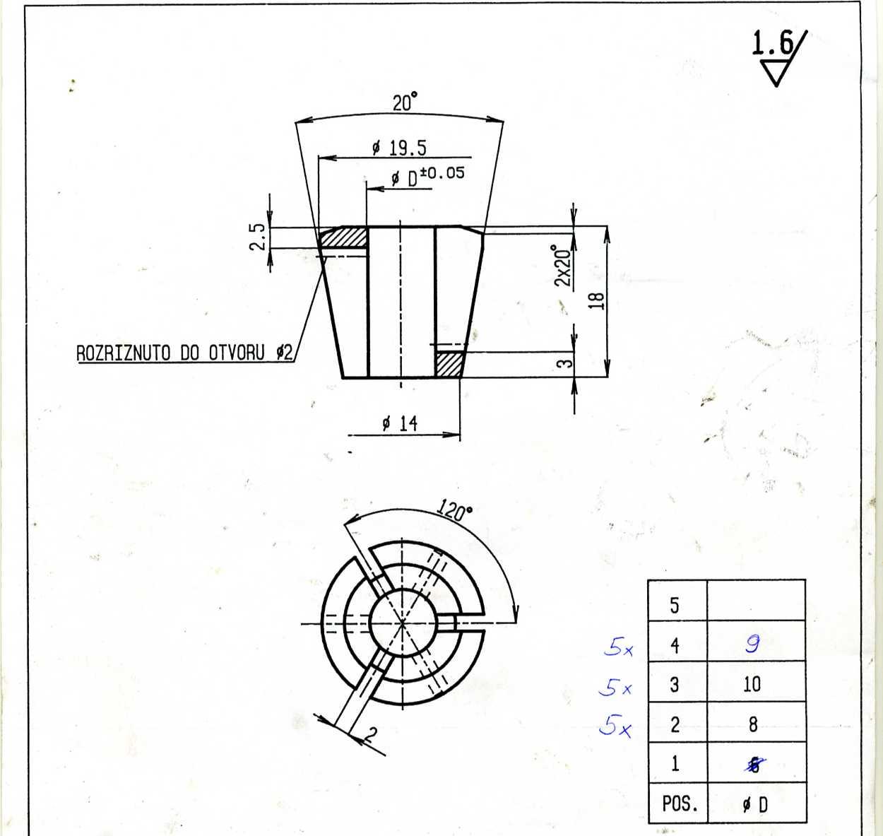 Na ty dvě kleštiny tech. postup nemám. Ale důležité je že měly na konci prodlouženou válcovou část aby je bylo za co upnout při broušení a pak se konec uřízl. A rozřezávaly se v děličce upnuté na trnu. Co se týče velikosti pilky tak se používaly malých průměru ale kleština byla kolikrát nakreslená tak že se to ideálně zkrátka nedalo proříznout tak jak to je namalované až do toho otvoru na konci drážky. A pro úplnost ta kleština průměr 19,5 s délkou 18mm byla silonová na upínání závitníků.