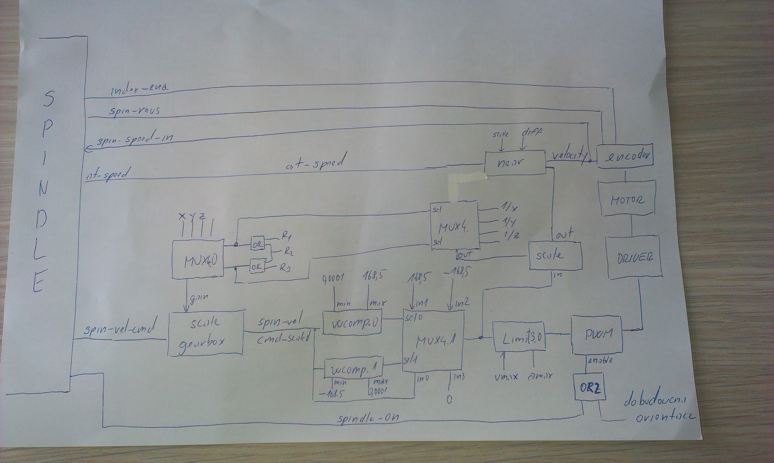 Nastaveni minimalni rychlosti motoru vřetena podle zarazene rychlosti a zpetna vazba pro spindle at speed