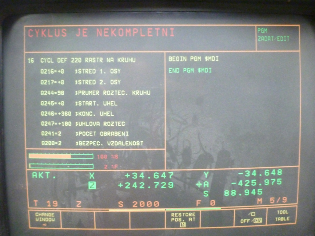 dokonce jsem zkusil spustit nějaký mnohokrát jetý starý PGM co mám v paměti, vrtání děr a řezání závitů na kruhu, opět to na bloku s rastrem na kruhu zahlásilo CYKLUS JE NEKOMPETNÍ