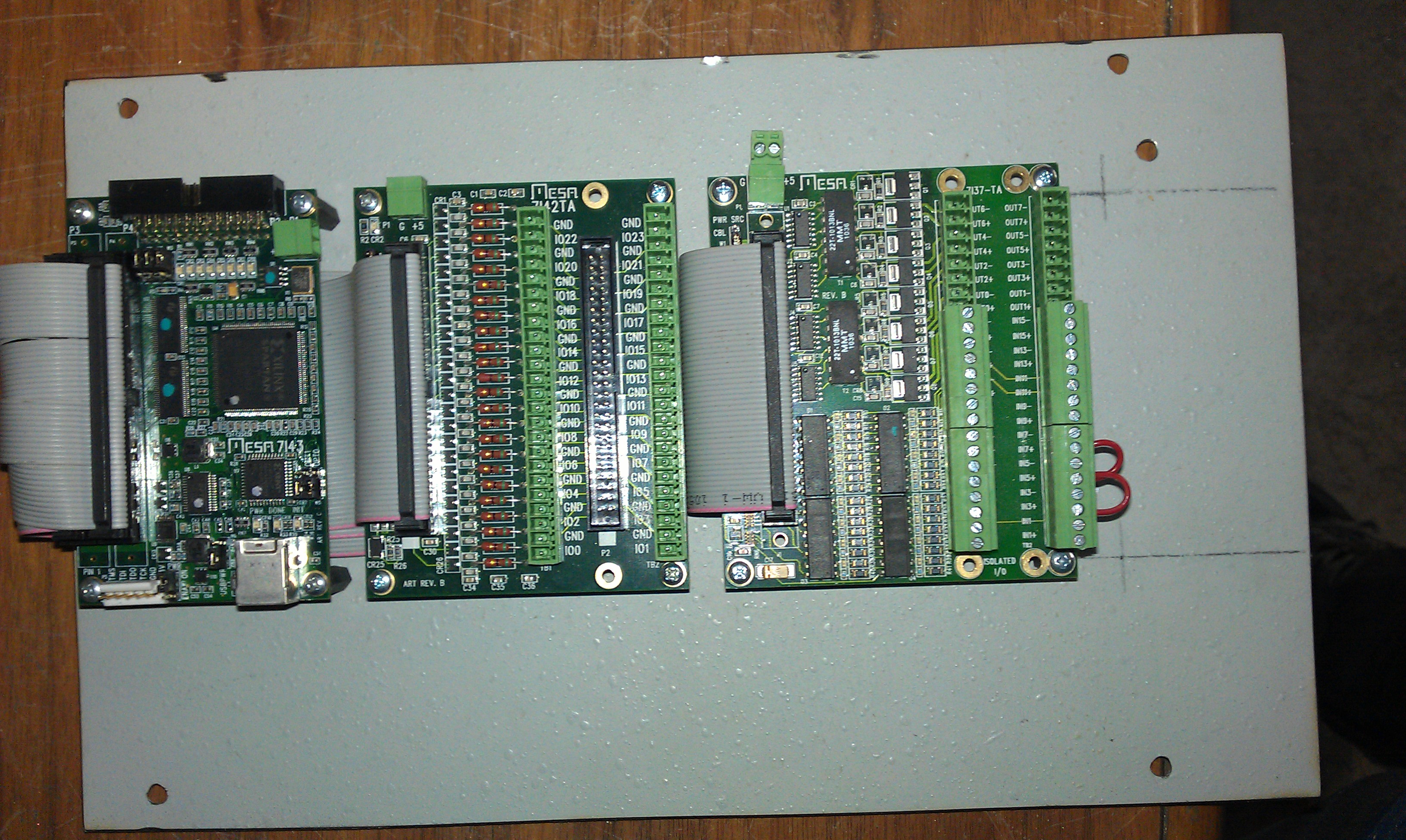 Řídit takovou pěknou mašinku pres LPT je kravina, takže bylo rozhodnuto pro MESU a EMC. Mach do baraku (garaže) nesmi. Zakoupil sem par karet a zacal experimentovat s driverama. Mistni guru přes elektromotory Lubos mi zapujcil drivery DCS810. jak analog, tak digital. Po počátečních neuspěších v nastaveni driveru pro motor jinych parametru nez doporučuje výrobce se mi podařilo najit vhodné parametry proudove smyčky i PID regulatoru. Takze ted jsou tam 3x DCS810 digital + 1x driver pro krokovy motor na Z napajene spínanymi zdroji 2x 24V.