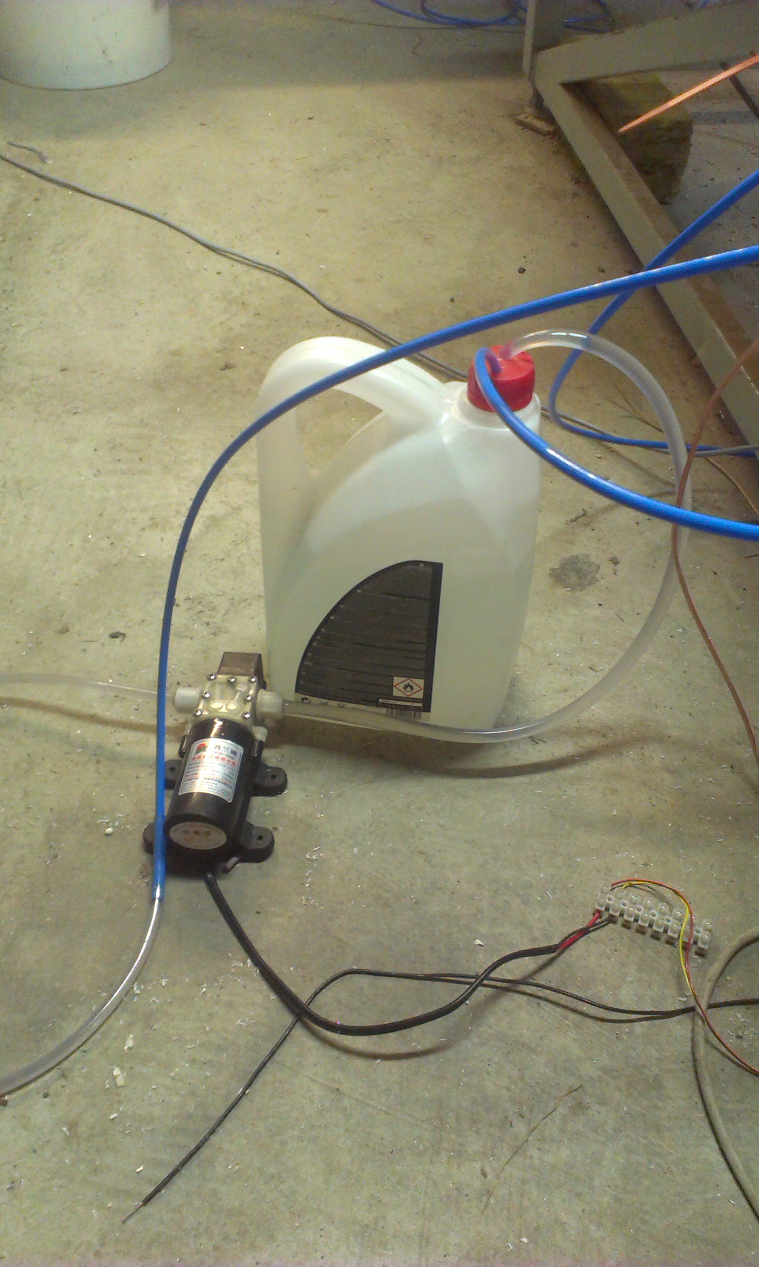 Co jeste neni dodelano, je chalzeni vretena. Zatim mam cerpadlo s dostatecnym tlakem, aby prohnalo potrebne mnozstvi vody dlouhyma tenkyma hadickama, zatim nezapojeny chladic ze srotaku a taky prutokomer z kavovaru, ktery bude hlidat prutok chladiciho media. Pri poslednich testech zapojeno pouze takto a po hodinovem frezovani byla voda pouze vlazna.