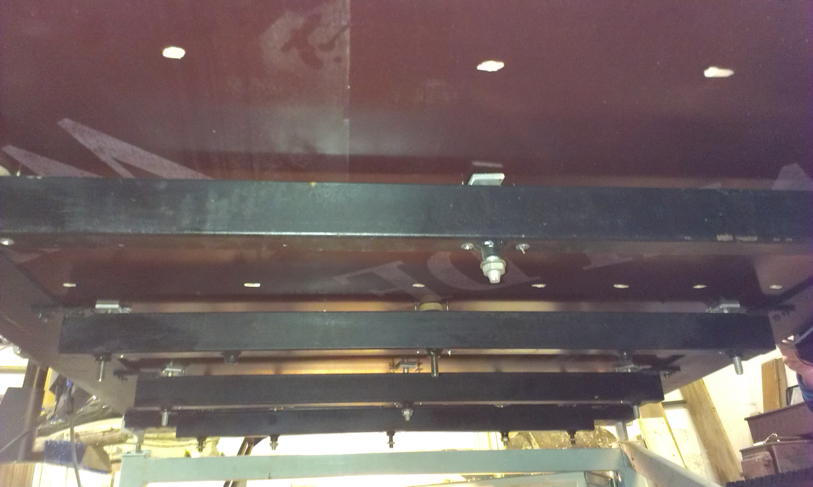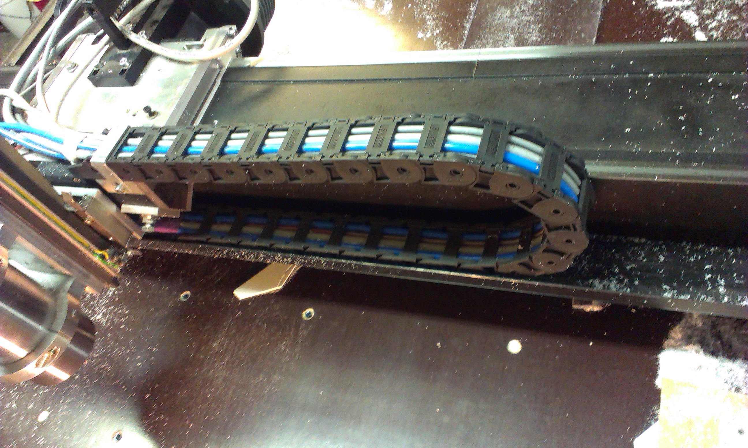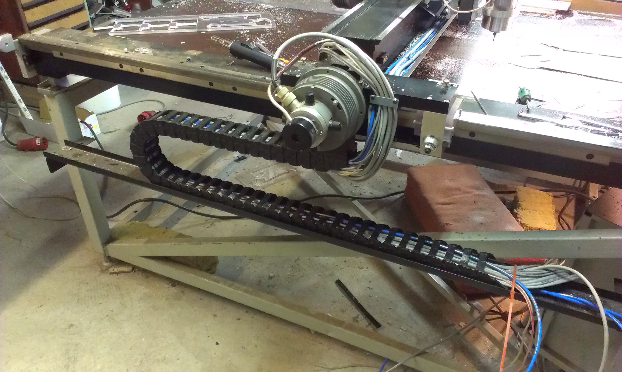 Na nasledujicich fotkach je puvodni "energo řetez" k voziku vyrobeny ze svinovaciho metru ktery jsem nahradil opravdovym energo retezem a to predevsim kvuli mnozstvi stinenych kabelu a taky kvuli nutnosti pridat 3 hadicky. jednu na vzduch pro ATC a dve pro vodu na chlazeni. Navic je tu pekne videt cela osa Z i vreteno a take snížení pracovní desky, ktere sem docilil prišroubováním štelovacich nosniku na spodni stranu nosnych profilu. Bordelu na pozadi si nevsimejte, mozna ho nekdy uklidim.