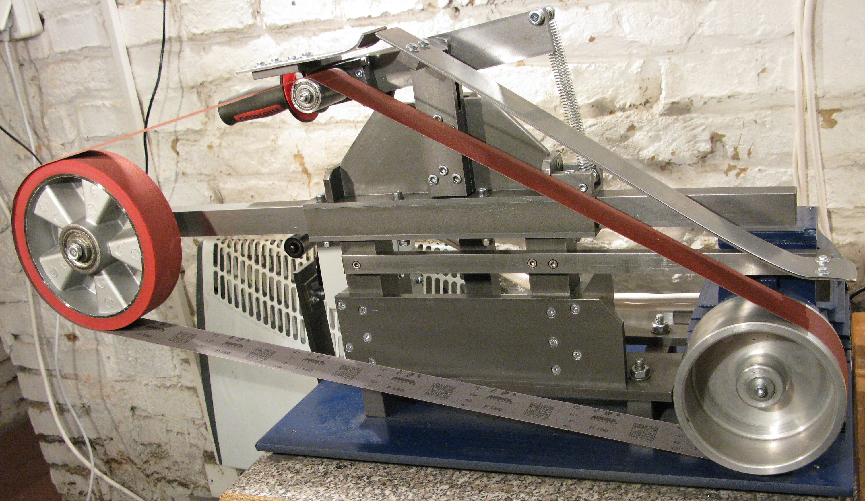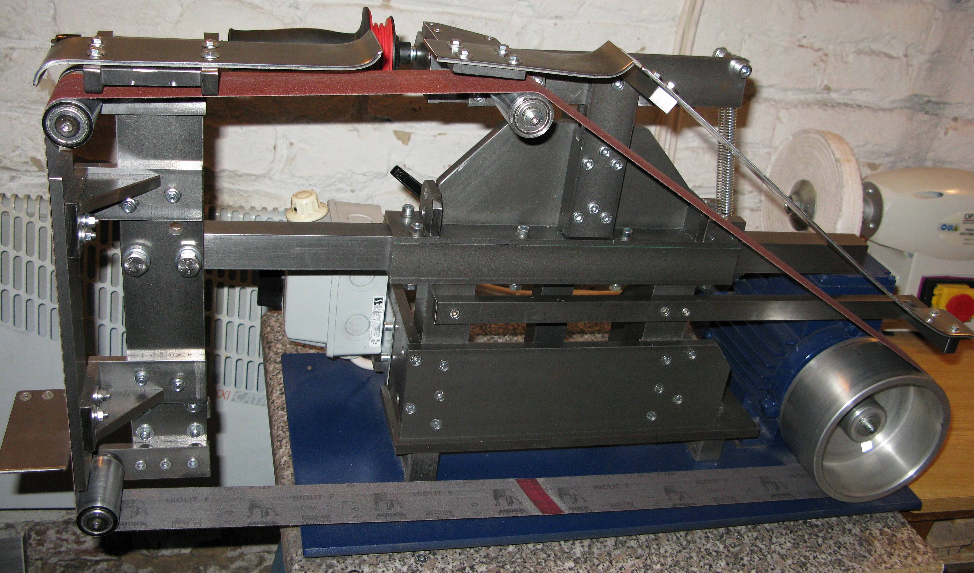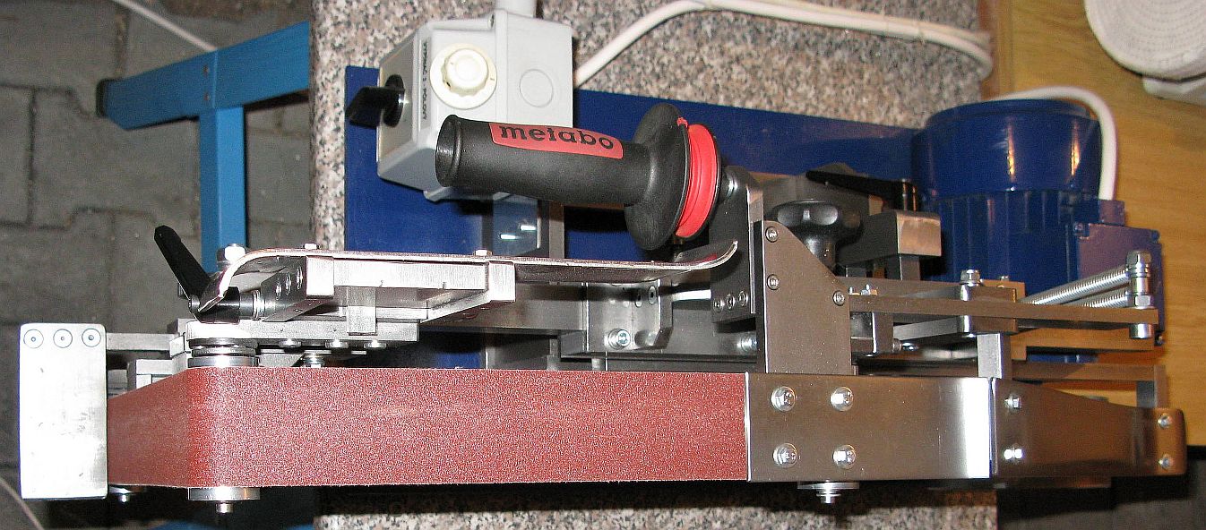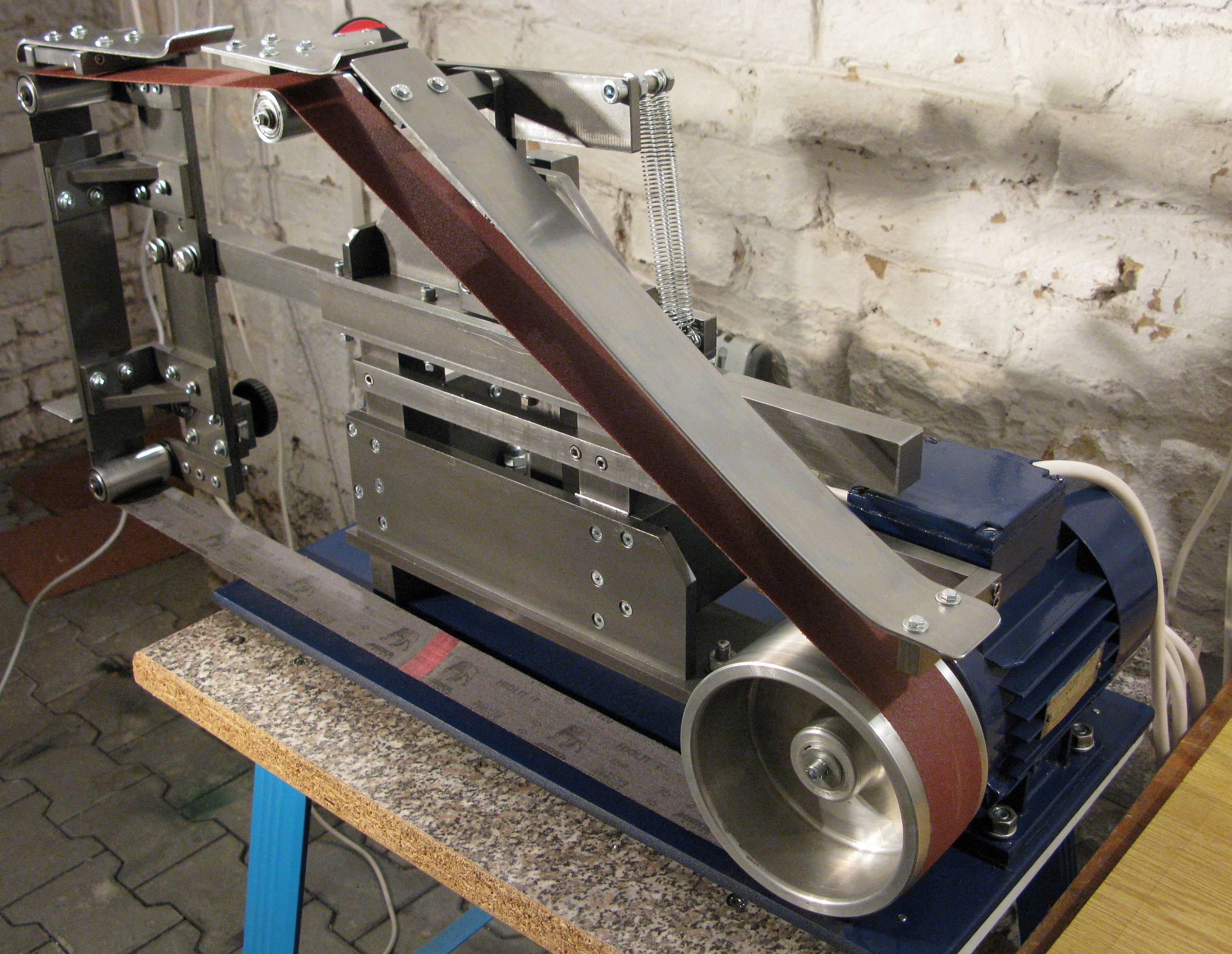 Moc pěkná mašinka. Vypadá to jako jedna z kopií KMG Belt Grinder ( http://www.beaumontmetalworks.com" onclick="window.open(this.href);return false; ). Na netu se dají najít i výkresy. Tady jsou dvě videa od výrobce, co vše se na tom dá dělat: http://www.youtube.com/watch?v=BYllaxuzMk0" onclick="window.open(this.href);return false; http://www.youtube.com/watch?v=jy_guBBaUTU" onclick="window.open(this.href);return false; . Průniky trubek pro svařování se na tom dělat dají, jak je z videí patrné.