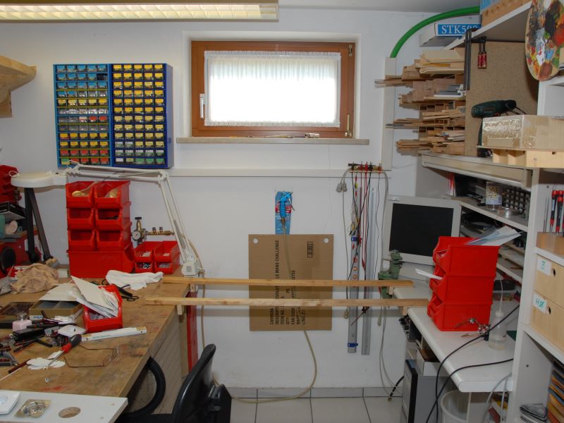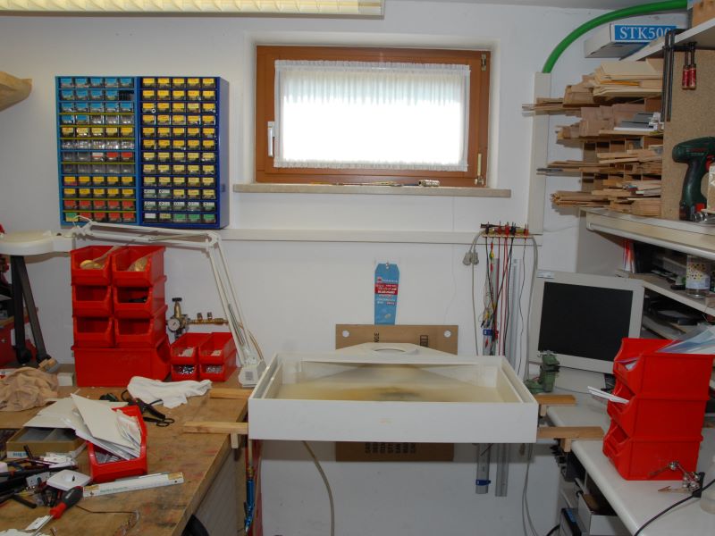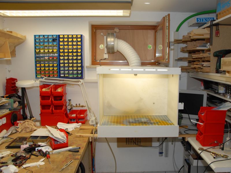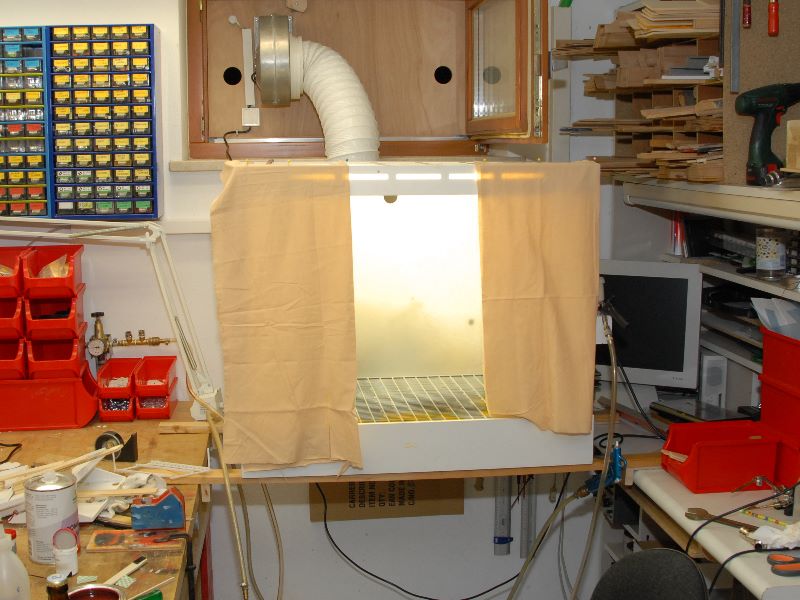 já když v zimě stříkal v dílně, jinak stříkám venku neboť je to strašnej smrad, tak jsem si natáhl vázací drát ze stěny na stěnu (skobičky v hmoždínkách) a přes tu drátovou konstrukci přehodil igelitovou malířskou plachtu..