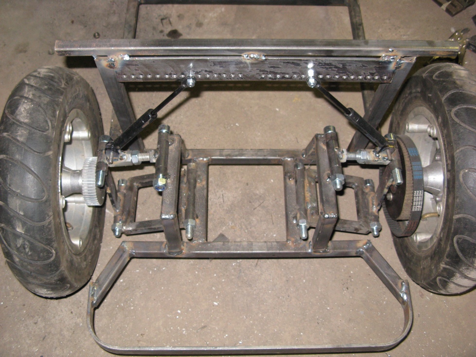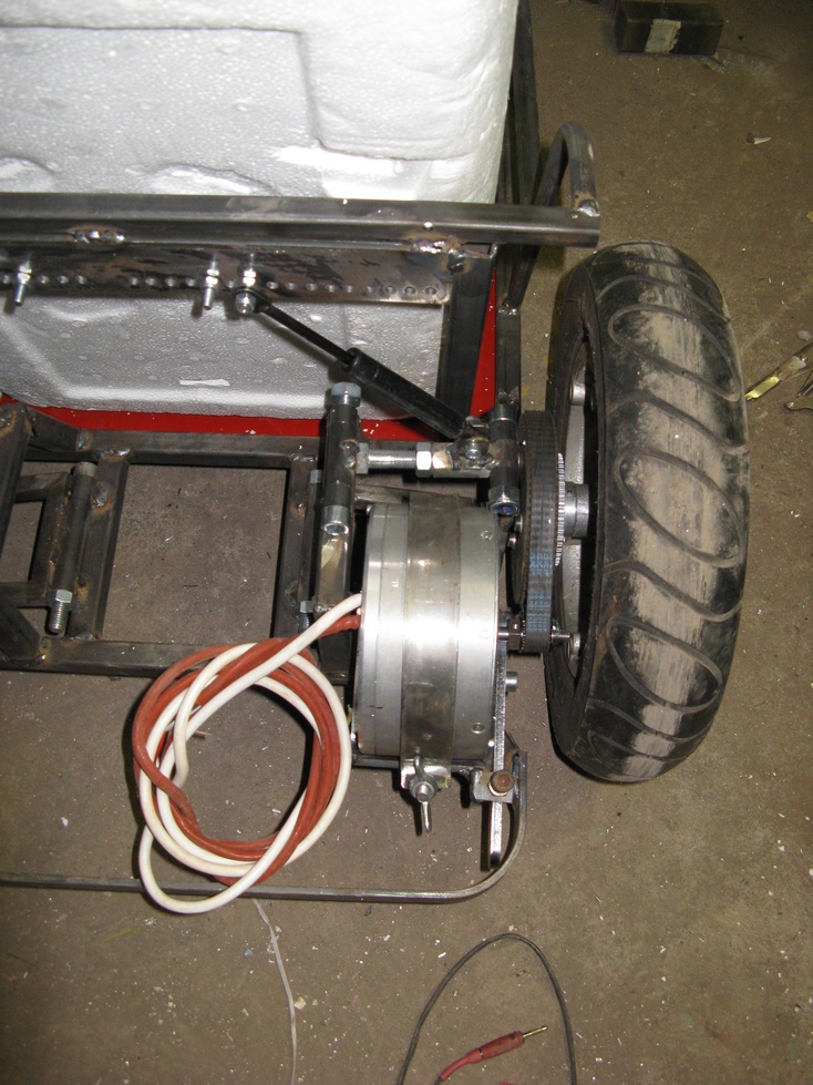 Tak jsem trochu pokročil , dodělán pohon - motor s integrovanou brzdou , ještě bych chtěl dát jednu brzdu přímo k druhému kolu kdyby třeba prasknul řemen tak aby byl sychr , kdyby někdo měl nějakou vhodnou tak nabídněte . dík .