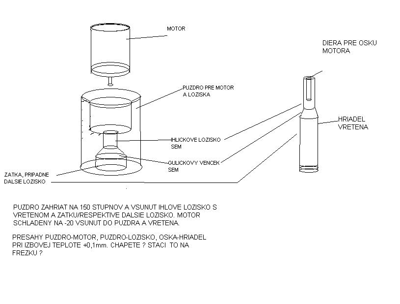 Nene, co sa tyka puzdra pre loziska a motor tak jednoznacne z hlinikoveho masivu, niekde mam este gulatinu 50x150. Oska s nastrojovej ocele kalena. Vybrus na ihlove lozisko kludne planetovou excentrickou bruskou a vretienko na stopkovej bruske. Takto by to slo na 5 tisicin, presah pre loziska predpokladam tak pol stofky , verim ze vsetko staci robit na stotiny, mazanie uzavrete postaci, klestinky kupim, oni stroje na to su, ale vecne obsadene