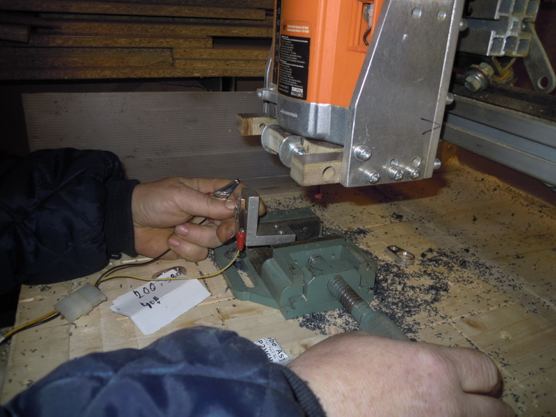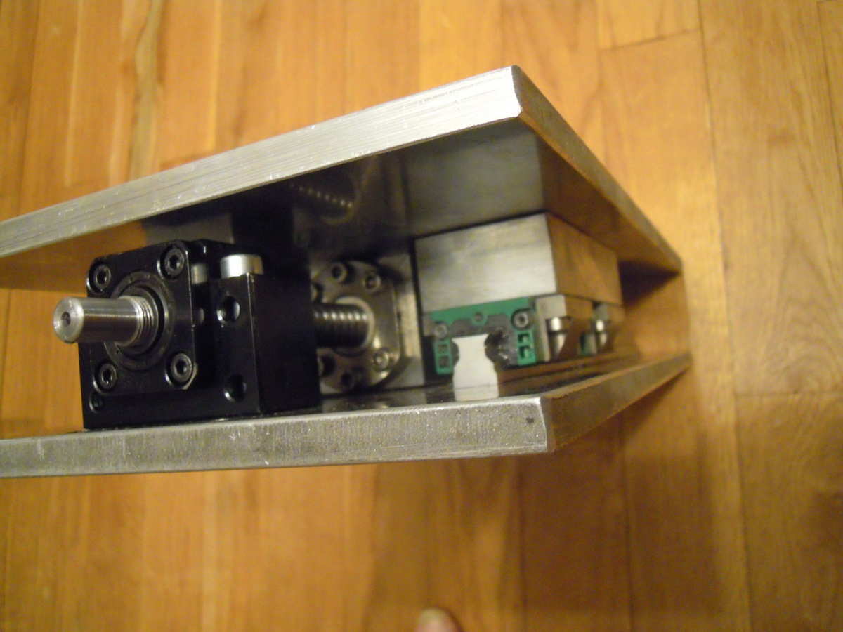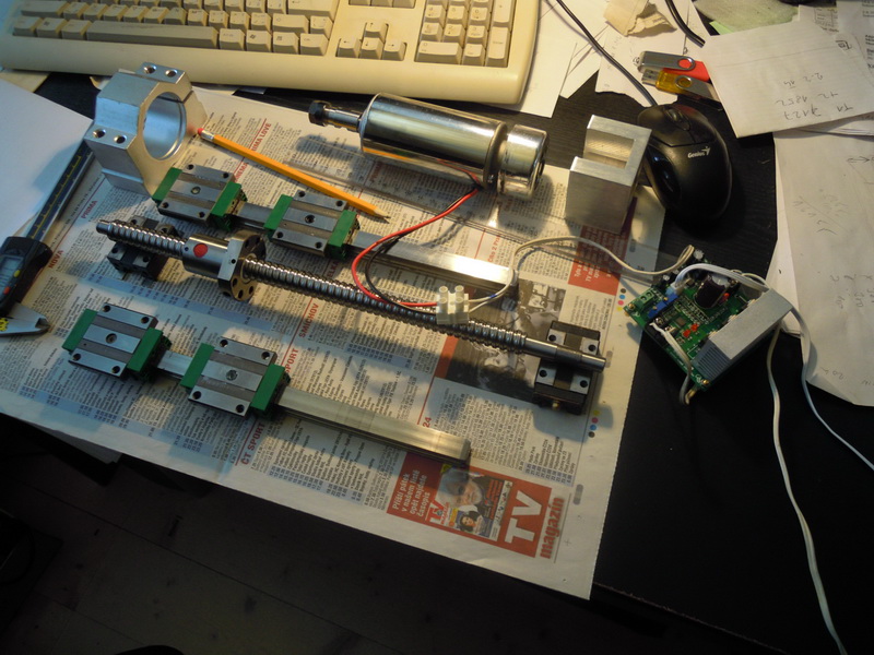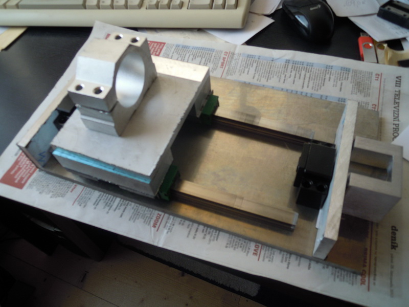 . Ještě mi jeden známý lízne jeden ze šroubů (nevešel se do ložiska), udělá kostku k desce a jde se na to. Stále čekám na ofrézování rámu a portálu - frézař je nemocný. Perun s nimi