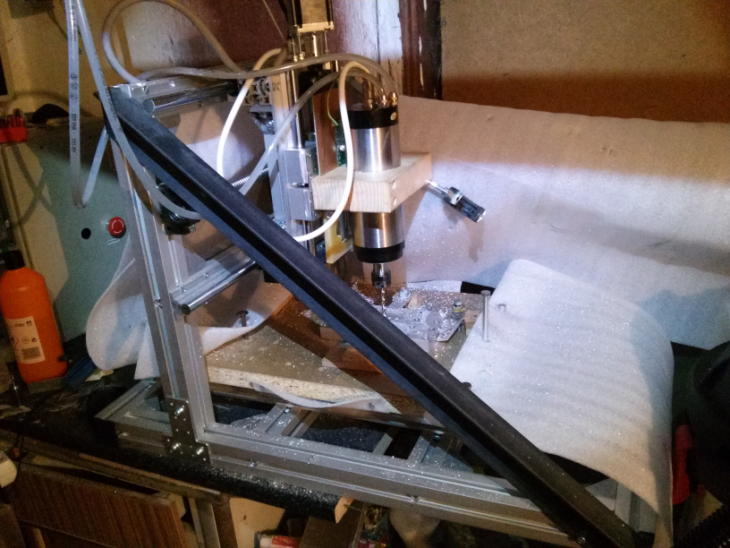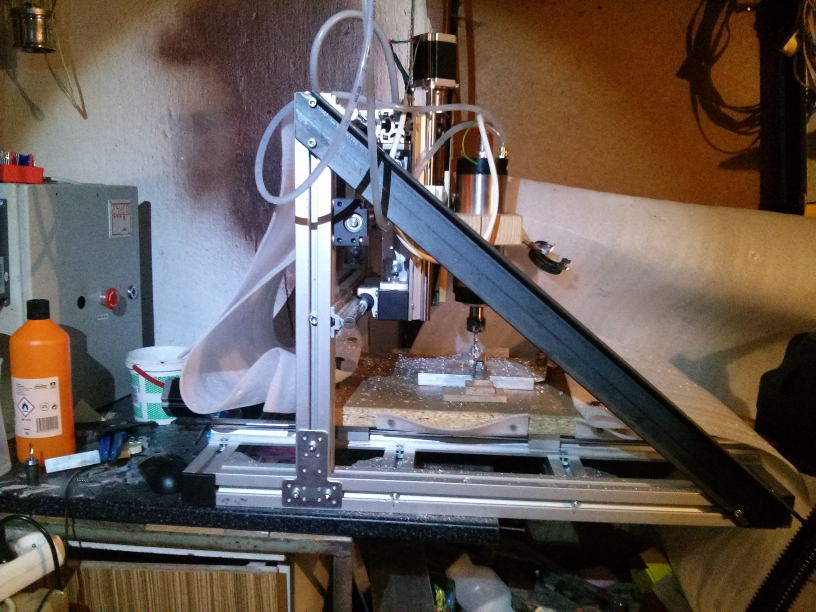 Jedná se o můj první CNC stroj. Profily nařezány na míru u nás, spojovací materiál z řeleřářsví a zbytek +- z ebaye. Momentálně je nejslabší díl dřevěný úchyt na vřeteno - boční síly při frézování s ním pohnou.