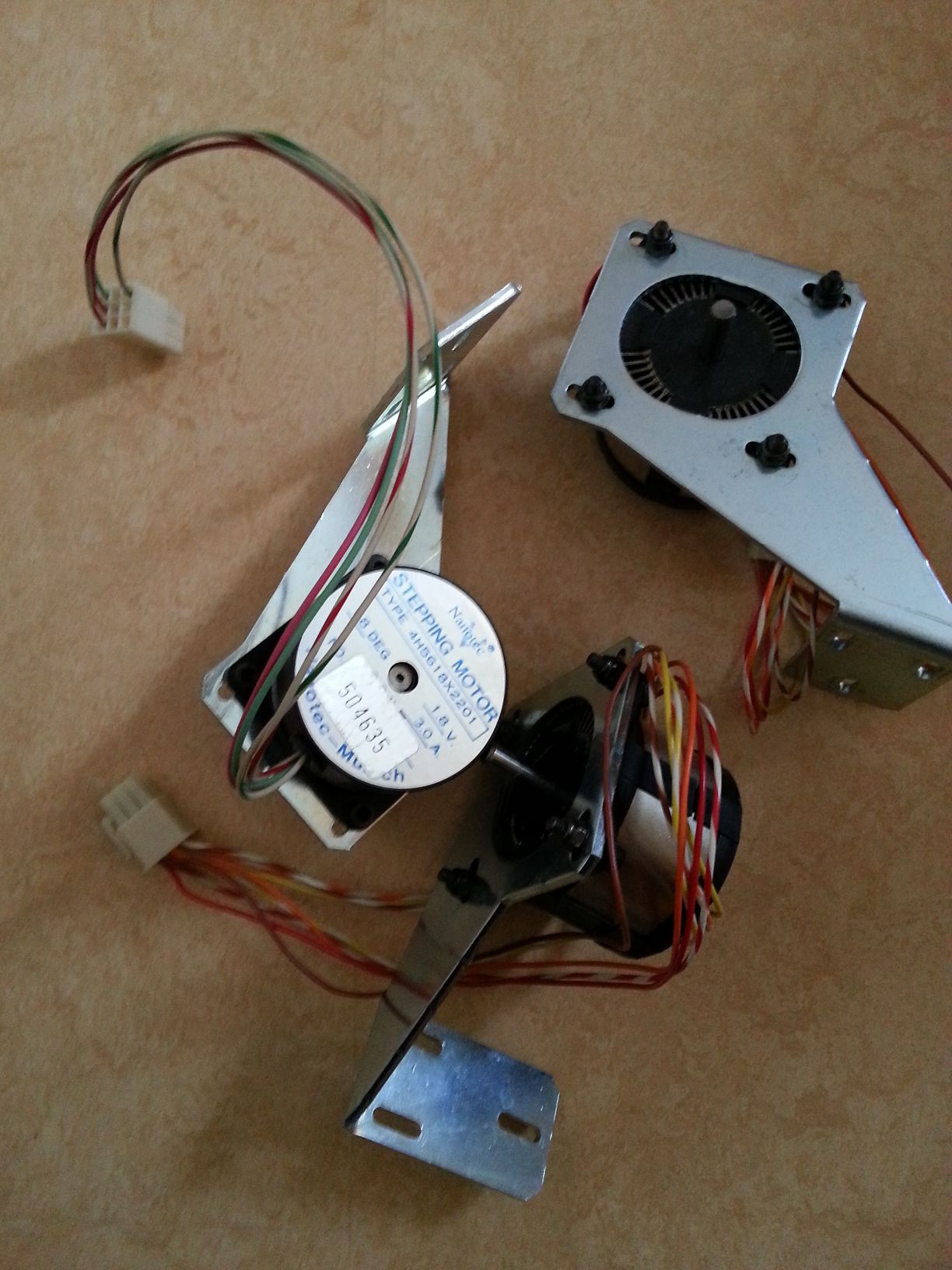 Nabízím 3 ks krokových motorů stejné velikosti. 2 z nich mají vyvedeno 8 vodičů, 1 má 4 vodiče. Průměr motorů je 55mm, výstupní hřídel 6,35mm, délka těla 40mm, délka osky 19mm. Včetně držáků.