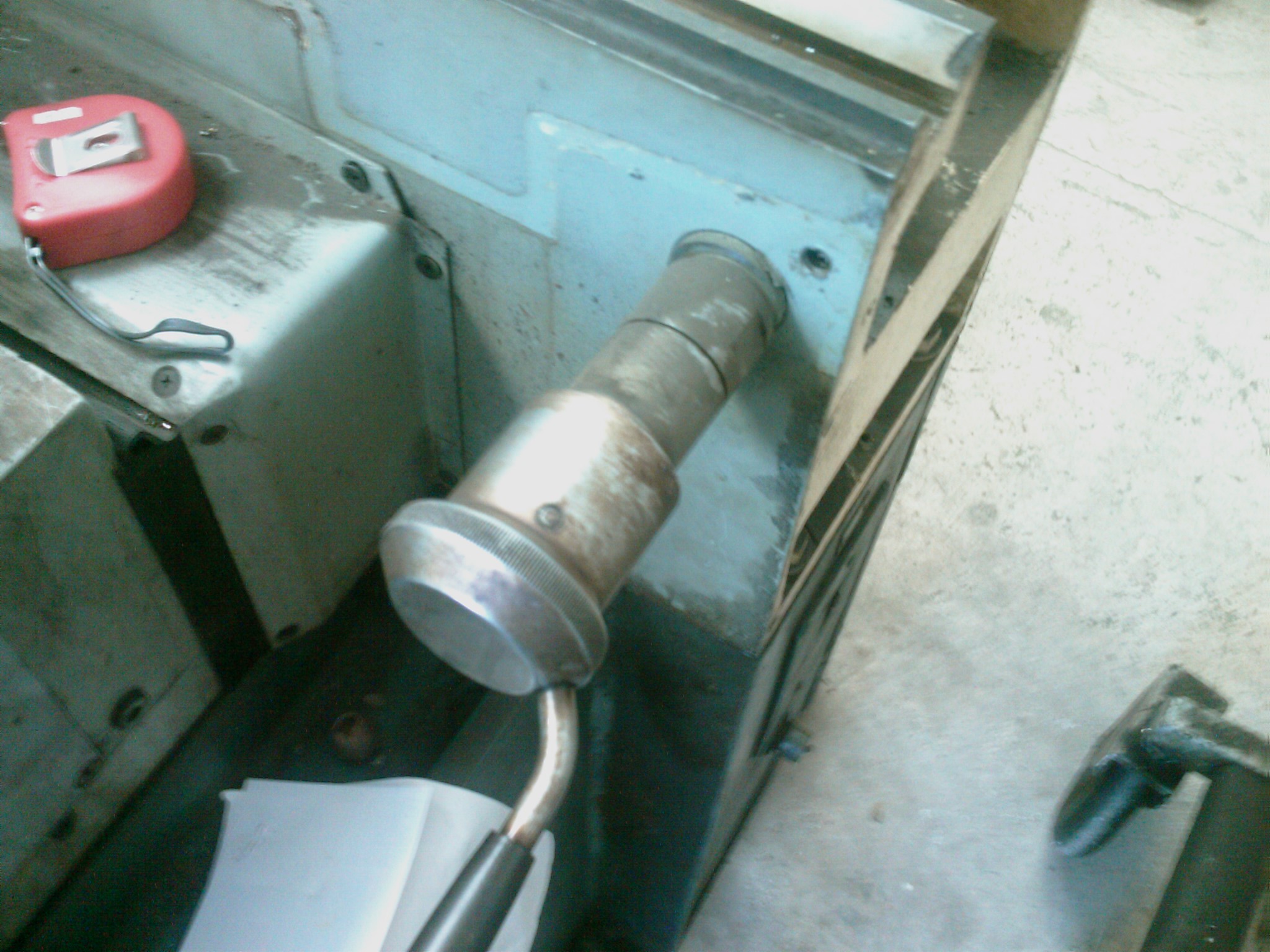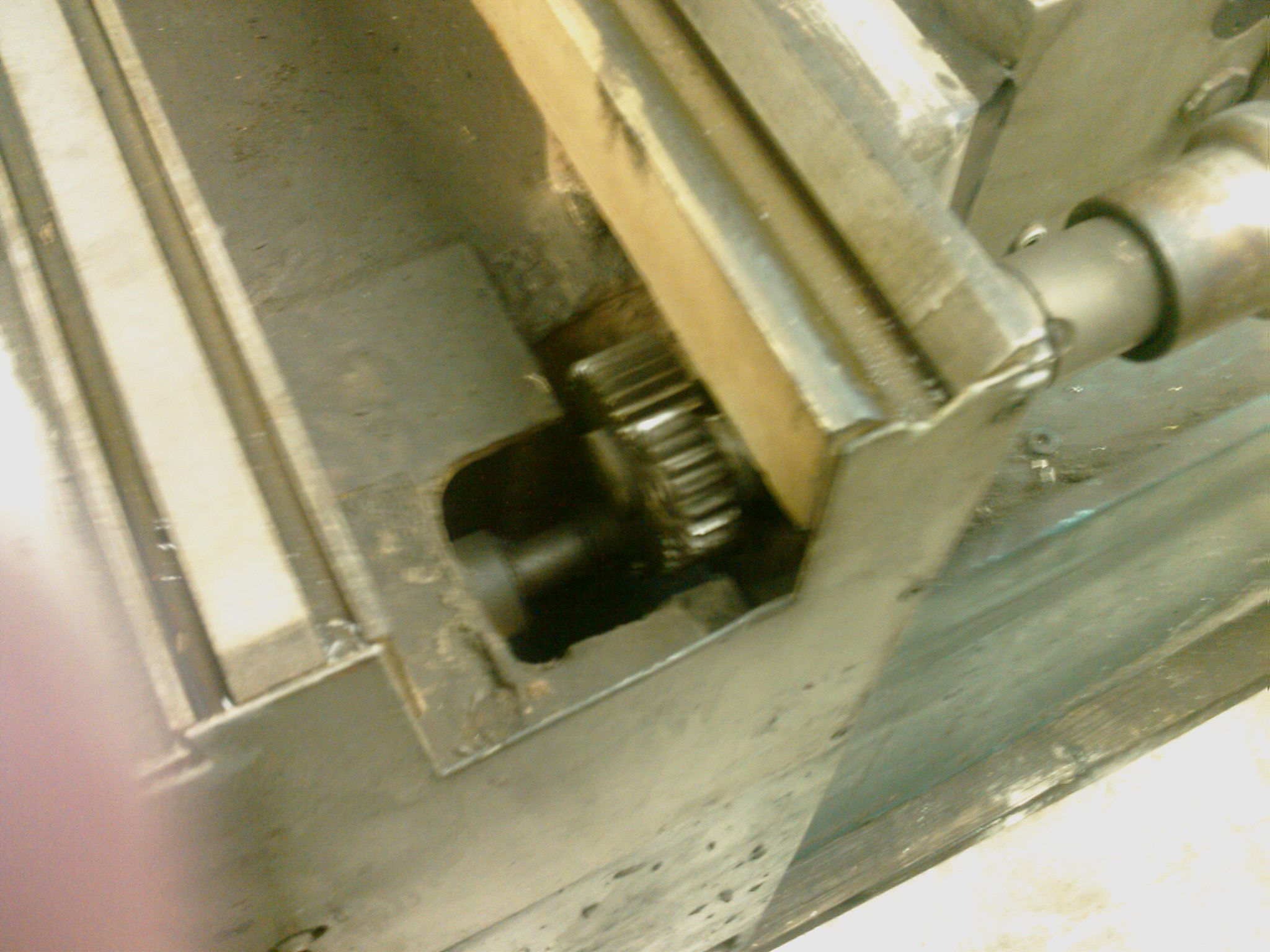 Jedině by byla možnost motor vystrčit na bok ven, ale i tam není moc místa (stůl má pak takovou plechovou zarážku aby nesjel dolů, co by tam vadila, přičemž v krajní poloze najede až úplně ke kraji toho prismatického vedení že tam není žádná mezera). Jedinou šanci tedy vidím připojit to nějak ze zadu z venčí přes levou kliku. Tu teprve budu sundávat a rozebírat kvůli čištění, tak uvidím jak je to konkrétně dělané a jak by se tam dala nějaká řemenice přidat.