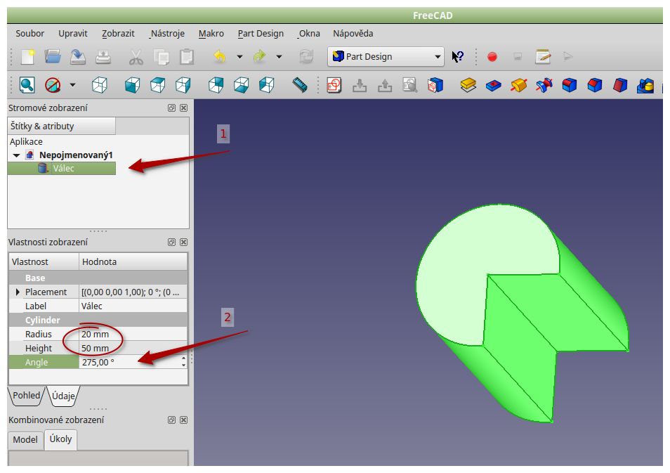 Part a vytvořit válec. U něj je jako jedna z hodnot "Angle", tím udělám tu výseč, kterou mohu v budoucnu kdykoliv změnit.