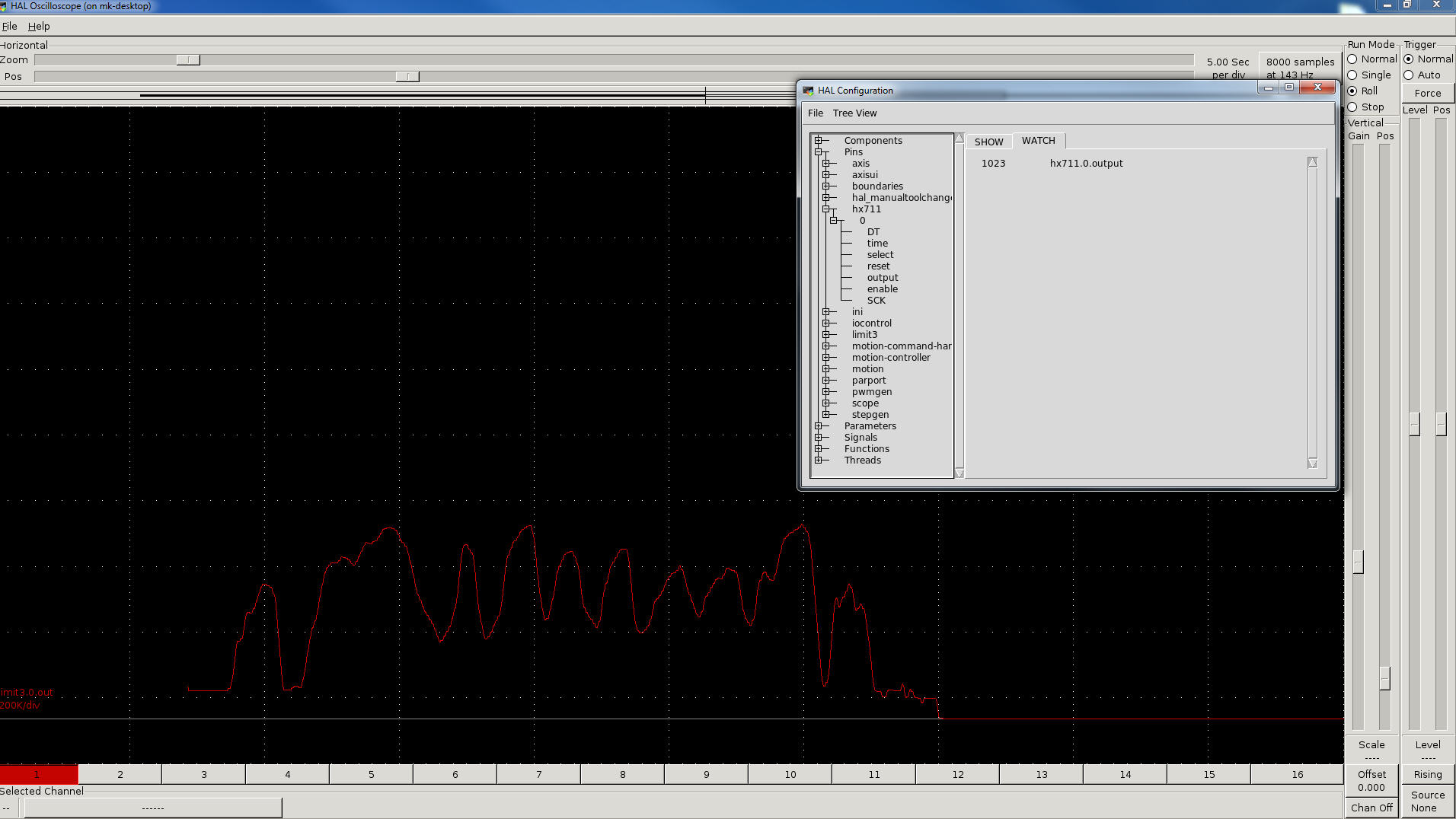 halcompile --install hx711.comp samozrejme pod rootem, aby jste měli právo zápisu do RealTime knihoven a i jedna vzorova konfigurace pro paralelni port, kde je pouzit jeden vstup a jeden vystup pro signály DT a SCK.