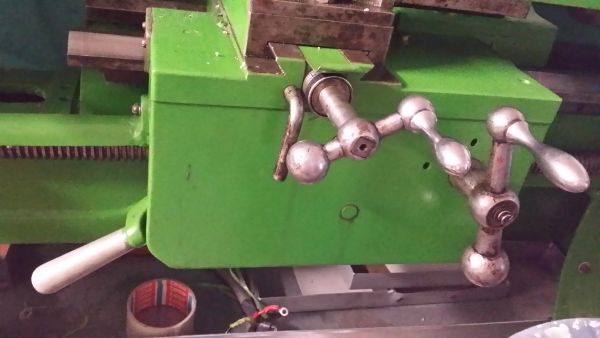 Jinak zde jsou fotky soustruhu (mimochodem pokud by někdo věděl výrobce/typ byl bych moc rád, bohužel na soustruhu není žádný štítek): Co se týče těch posuvů tak posílám foto suportu: Páka vlevo slouží k odpojení matice od šroubu, zahnutá páčka vlevo vedle kliky příčného posuvu slouží k zapojení (zastrčením) strojního příčného posuvu, klika zcela vpravo je pak podélný posuv. Bohužel žádné další ovládací prvky (na možnou redukci posuvu ze závitových na ubírací) tam nejsou. Proto jsem chtěl soustruh doplnit o nezávislý pohon šroubu s fr. měničem a možností volit si libovolný posuv.