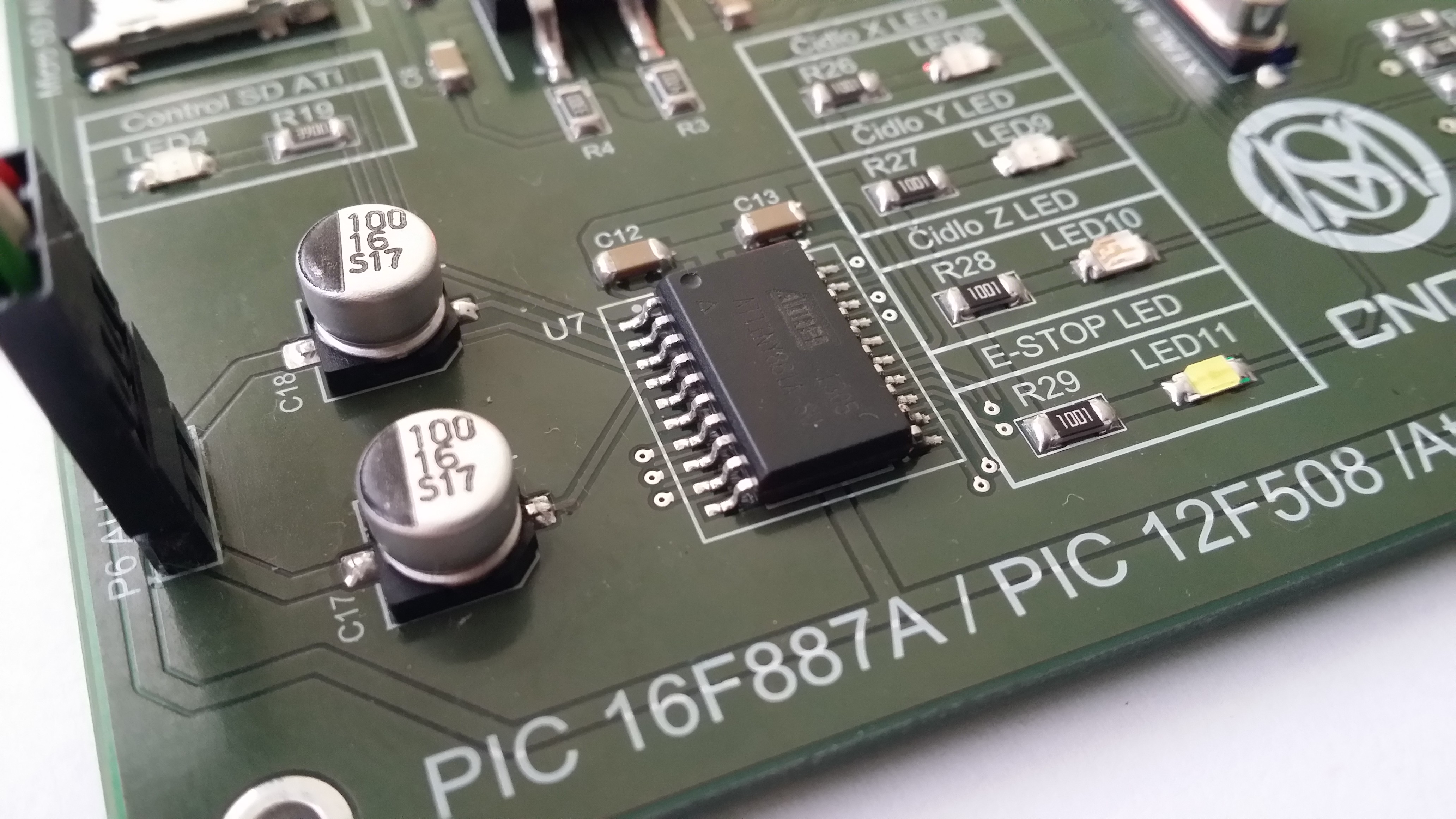 Tuhle CNC - X1 desku řídí Mikrokontrolér PIC16F877A. Na desce je vidět, že i při nezapojených výstupech je možnost podle led signalizace zkontrolovat funkčnost zapojeni desky.
