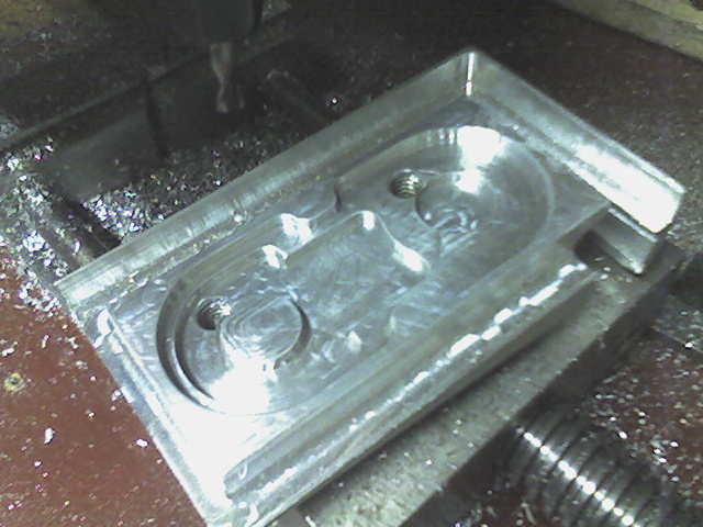 Zkusil sem vytvořit formičku na článek energořetězu pro plastovstřik. Zkouška je dobrá, tak teď to vypadá na doladění a vyrobení finální verze. Na obrázku je zkušební polovina formy. Na "videu" zkušební kus obráběn narychlo 6-tkou drážkovačkou. Ještě připojím obrázek ingotu před a po hrub.