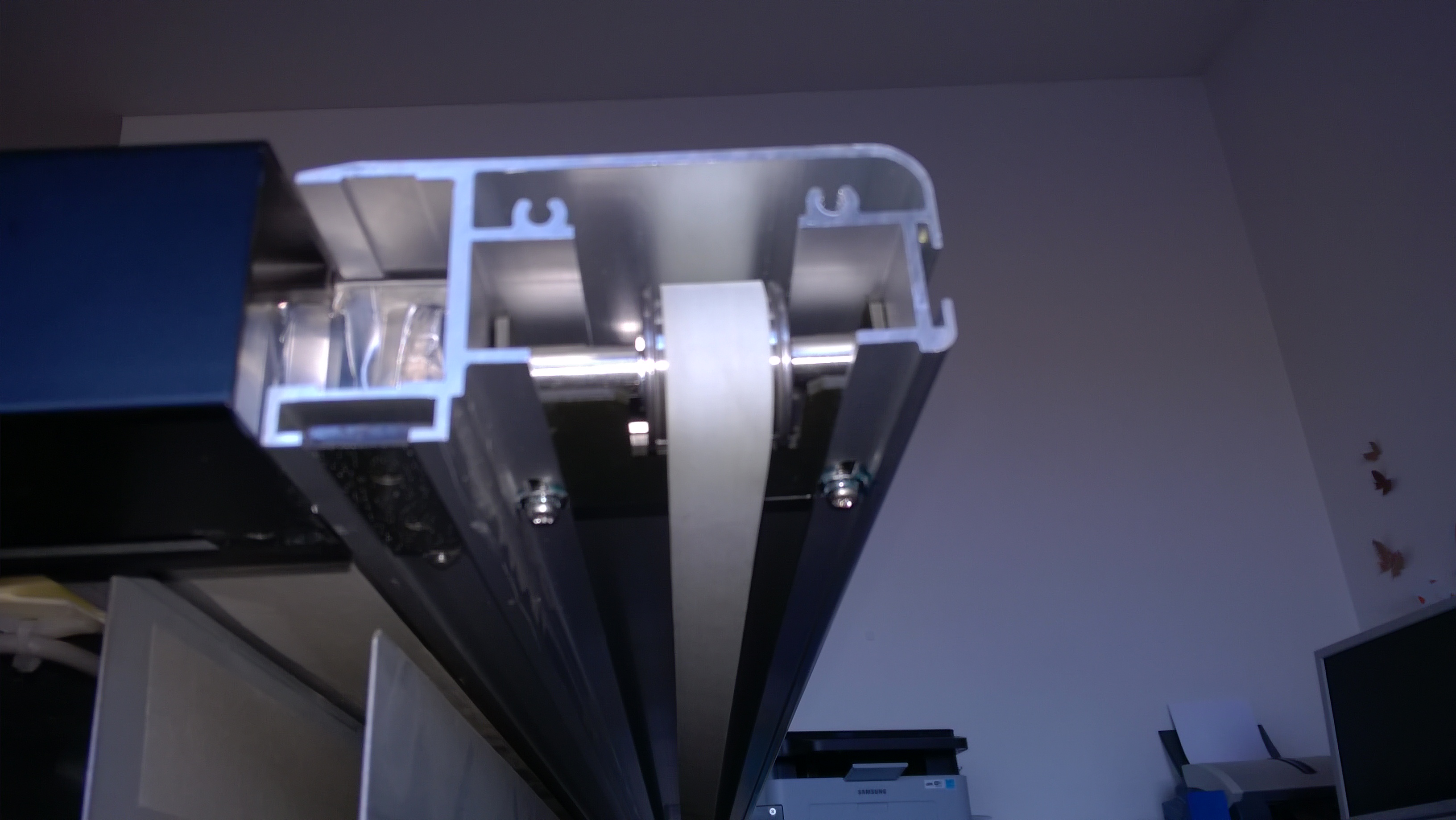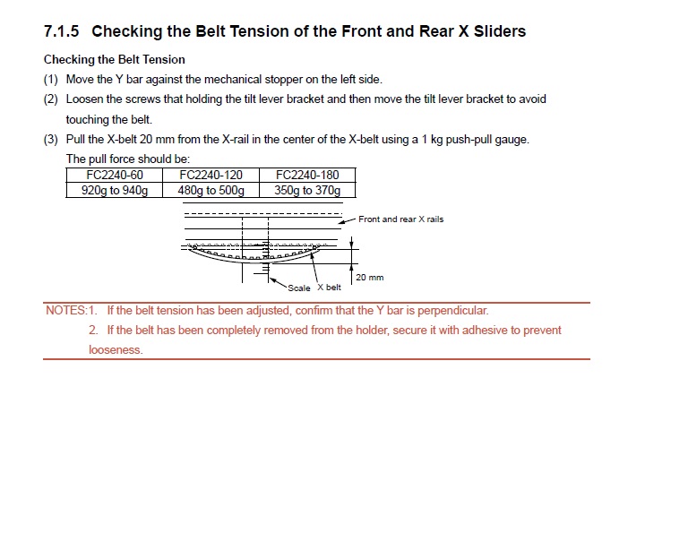 Vůle v mechanice jsem doladil ale mám trochu problém s napnutím řemenů. Hlavní nedostatek je, že plotter nemá napínací šrouby pouze aretační, zřejmě ve fabrice měli nějaké udělátko jako napínák. Celá mechanika napínání je vidět na fotografiích. To že si nějak přizpůsobím napínáky tak abych je mohl natahovat šrouby, tak to není problém. Ale trápí mě intenzita napnutí. Vím že musí být levá i pravá strana osy X napnutá stejně jinak bude problém. A taky intenzita napnutí, originál servisní manuál nemám pouze k novějšímu plotteru FC2231-90 ale napnutí by mělo být stejné. řemen má celkovou délku cca 3m na jedné straně je ozubené synchro kolo a na druhé napínací kladka mezi nima je cca 1,5m a dle manuálu pokud vezmu závěsnou váhu a použiju tah cca 0,5 kg tak by se měl řemen prohnout o 2cm, viz příloha.