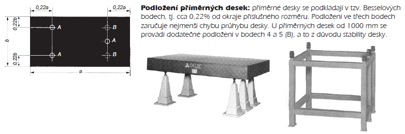 Podpěry mají být právě tři (rovina je dána třemi body), každá další tam bude zanášet průhyb podložky. Besselovy body (leží zhruba 1/5 od kraje) zaručují minimální průhyb volně ležící desky.