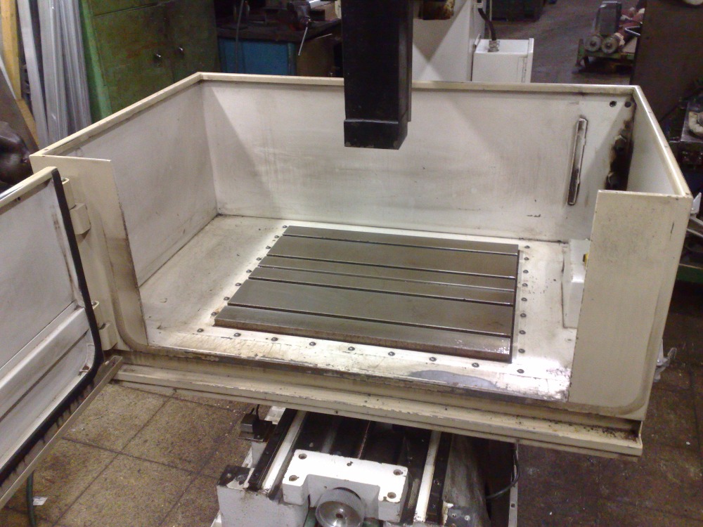 Prodám základ na 3-osou cnc frézku. Je to starší hloubička rok 1993 nebo 94. Agie elox mondo 30. Váhu odhaduji něco kolem tuny, je to masivní celolitinová konstrukce. Velikost vany = 830×670×320mm, velikost upínacího litinového stolu s T-drážkami 650×510, pojezdy X/Y/Zmm = 350×300×250