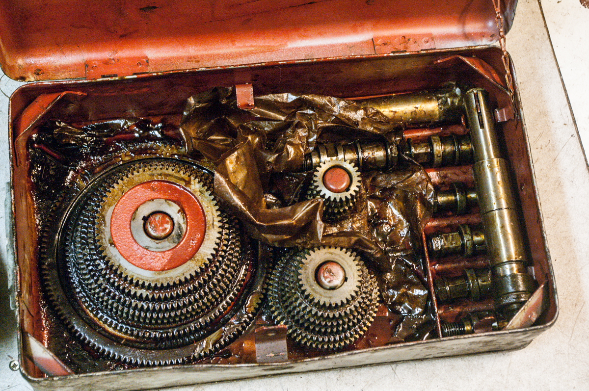 První je krabice kol k děličce, díky martinodipraga za identifikaci, je to k DU200, modul 1,5. Přibral jsem ji ve spěchu, když jsem kupoval děličku pro svoji frézku 675P, doma jsem bohužel zjistil, že k ní nepatří. Celé se to koupe v konzervační vazelíně, pravděpodobně nikdy nenasazeno. Upínací průměry malá lyra 35 mm, velká lyra 28 mm. Jinak vypadá kompletně, až na jeden výřez v plechu vedle velké lyry.