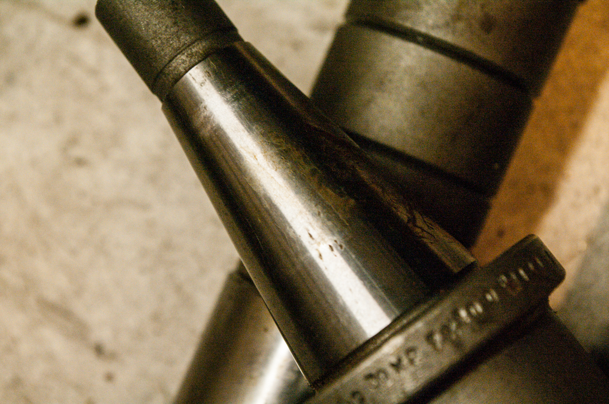 Dále tu mám čtyři horizontální trny ISO30x27x200. Jsou na nich zbytky konzervační vazelíny, vypadají nepoužitě, až na jeden, který má viditelný otisk po upnutí do dutiny (nejde o poškození, jen o otisk, viz. foto).