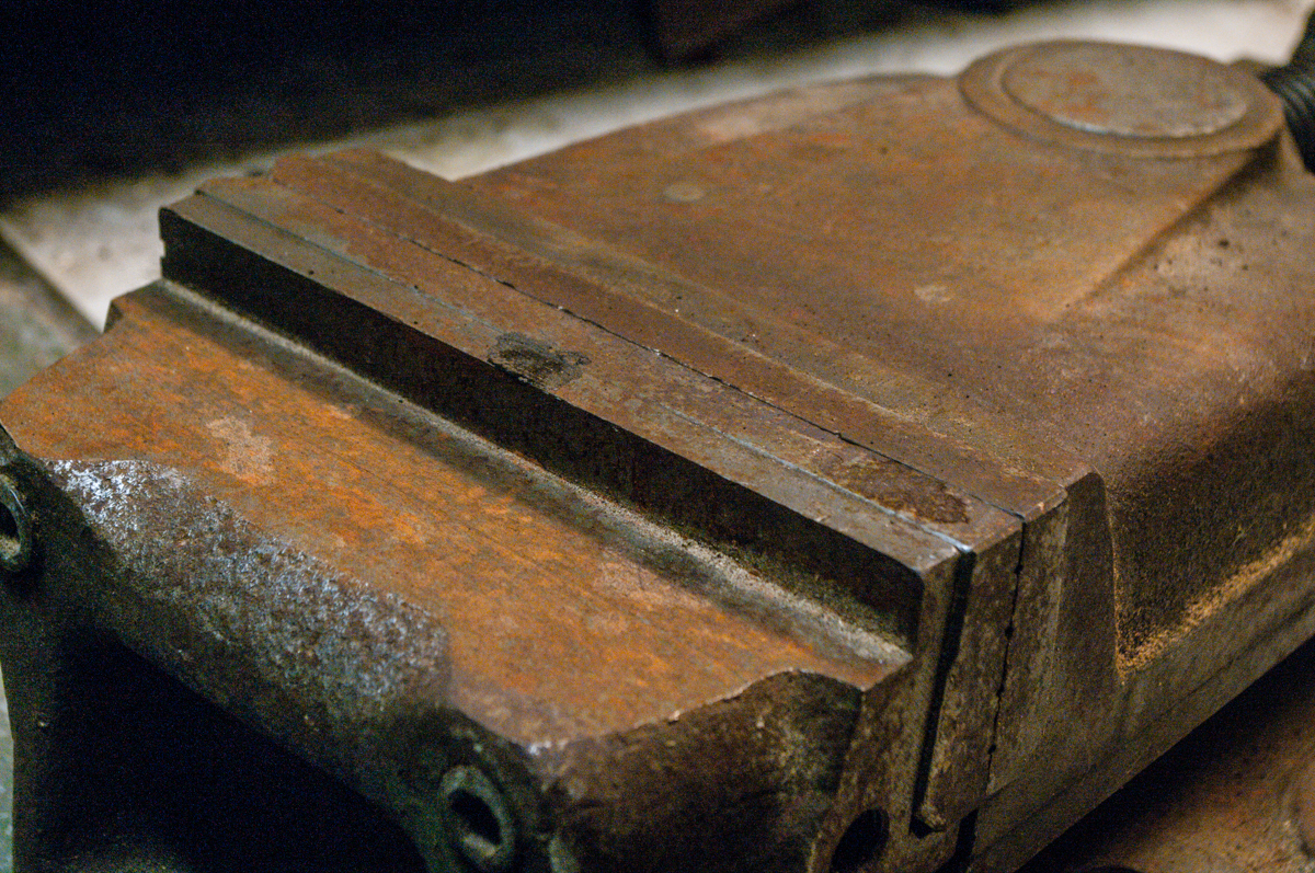 A nakonec svěrák, který se ke mně dostal víceméně omylem. Šířka čelistí 200 mm, stav orezlý, čelisti s malým zafrézováním na jednom konci. Šroub má samozřejmě vůli, nezkoušel jsem regulovat. Na kluzné ploše jeden závrt hned u čelisti, jinak běžně potlučená od obrobků. Pohyblivý člen se jeví bez vůle. U pevné čelisti je zafrézování, zřejmě kvůli používání kotoučových pilek. Nemám čas to čistit, nicméně myslím, že pod tím humusem bude kus slušně použitelné litiny.
