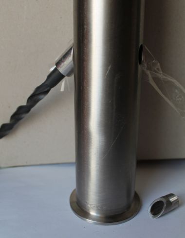 Dva různé otvory do nerezové trubky a navíc pod úhlem 45° jsem jen navrtala a pak poctivě ty "elipsy" vypilovala podle vhodného konce vrtáků aby to sedělo...